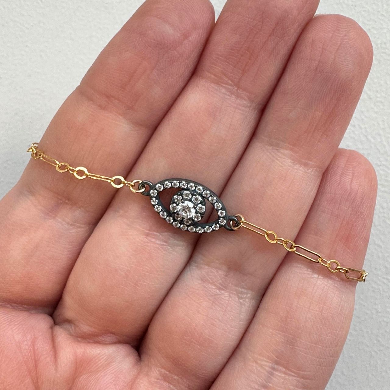 Style: 3+1 Flattened Paperclip Chain with CZ Evil Eye Connector