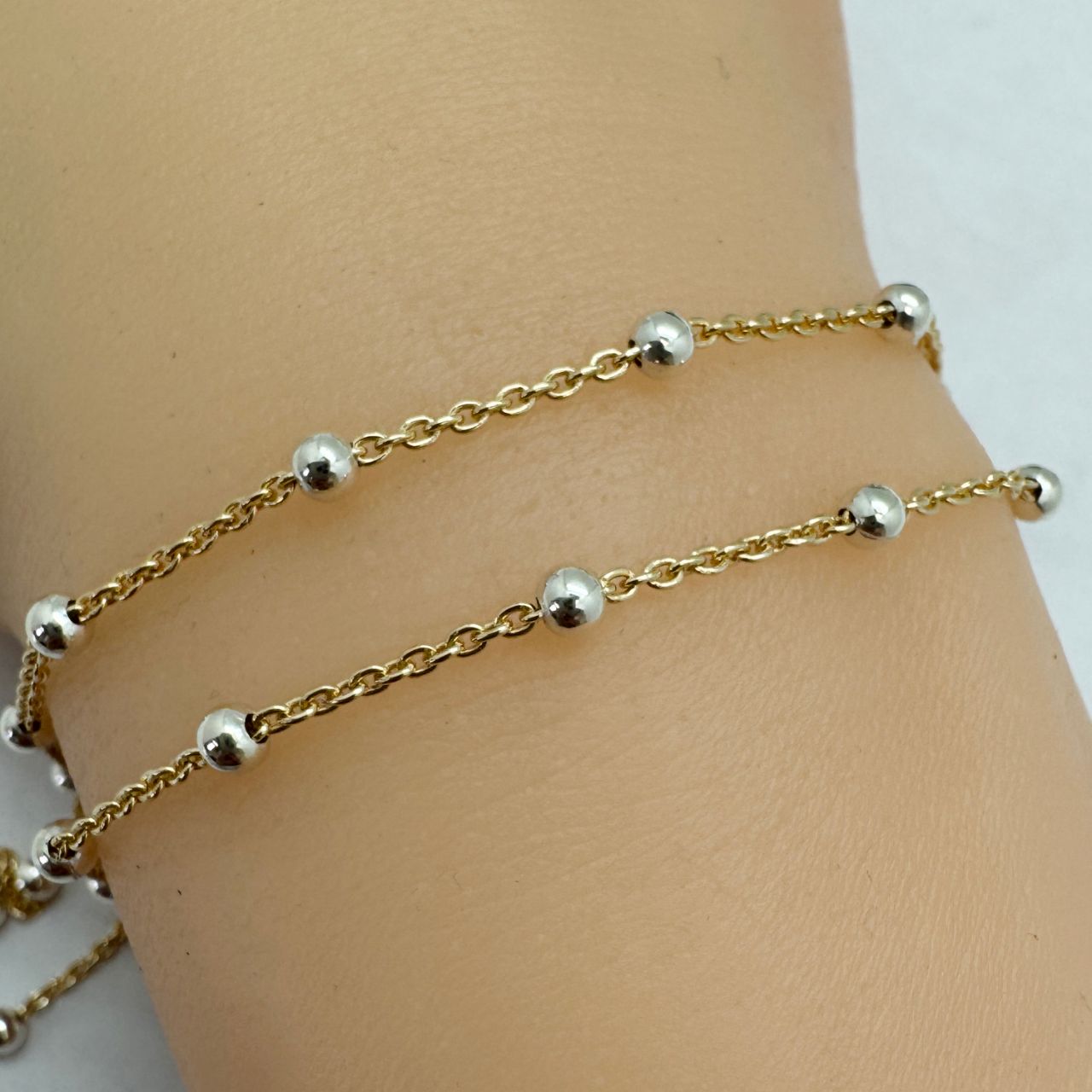 Add to compare list 1/20 14K Gold Filled and Sterling Silver Two Toned Chain - 1.8mm Ball Satellite Cable Chain (Sold per foot) SKU : 101125 Ball: 1.8 mm 26 links per inch (2 balls) Log In for Wholesale Prices