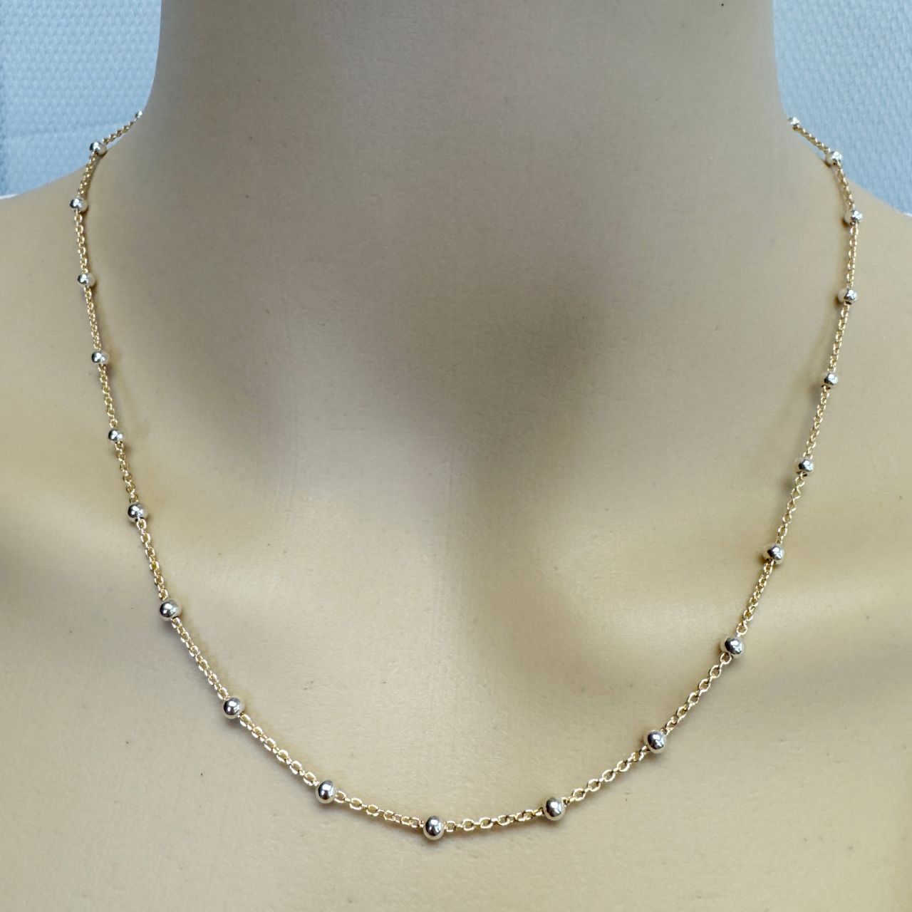 Material: 14K 1/20 Gold Filled With 925 Sterling Silver ball. Shape: Gold Filled Satellite Cable Chain with Sterling Silver Ball Beads Component size: 1.6mm x 1.3mm; ball is 3mm in diameterLinks per inch: 18 links per inch, 2 balls within an inchOrigin: Italy