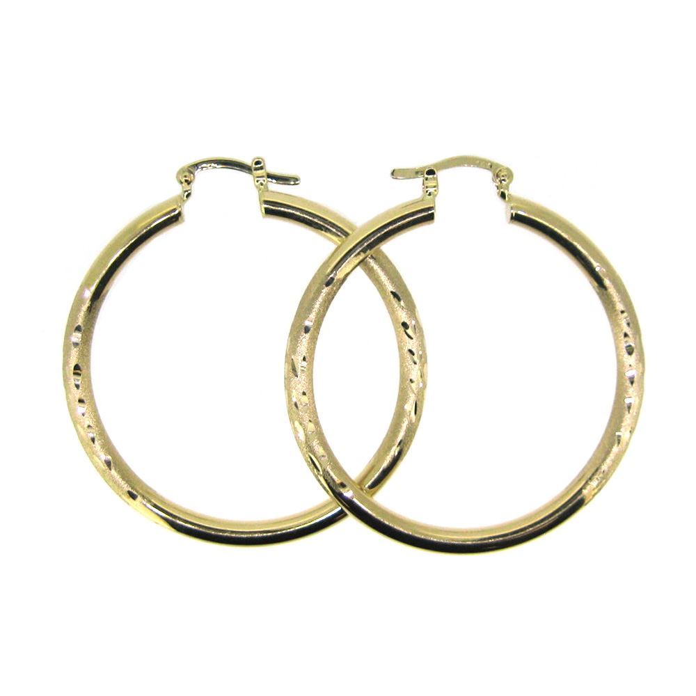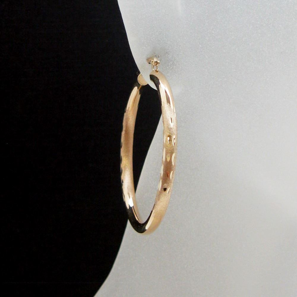 Material: 14k Solid Yellow GoldShape: Simple hoop style with fancy designComponent size: 40mm in diameter, 3mm thickness