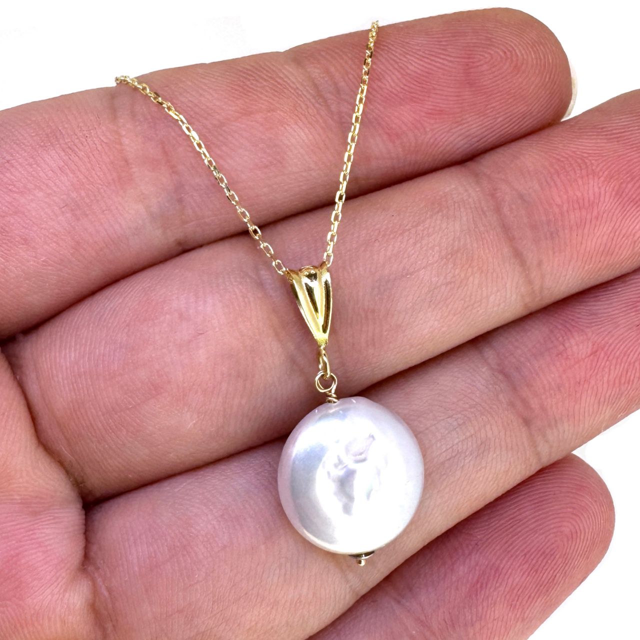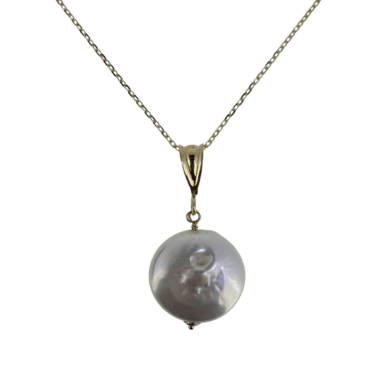 A simple, coin shaped freshwater pearl hangs from a 14K yellow gold chain. This necklace is the perfect accessory for any bridal party or the perfect birthday gift, especially for June birthdays.