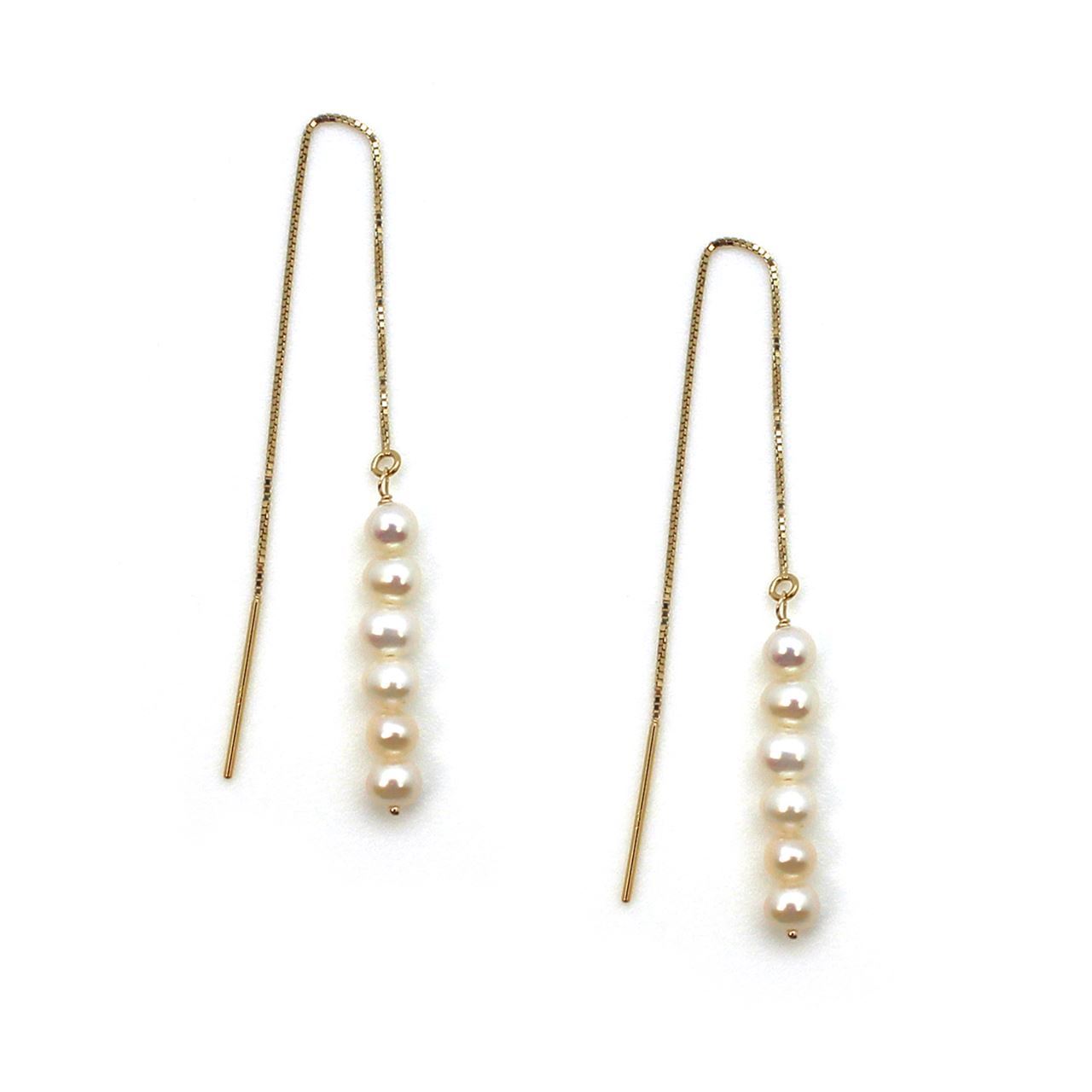 Gold threader earrings with stacked freshwater pearls bring a modern elegance to any outfit.