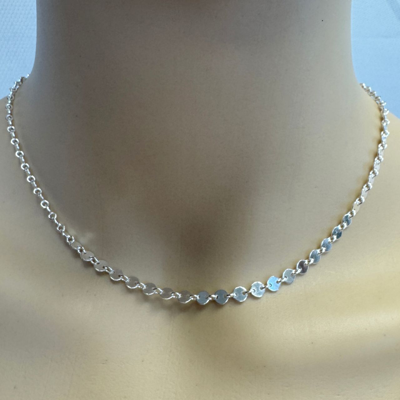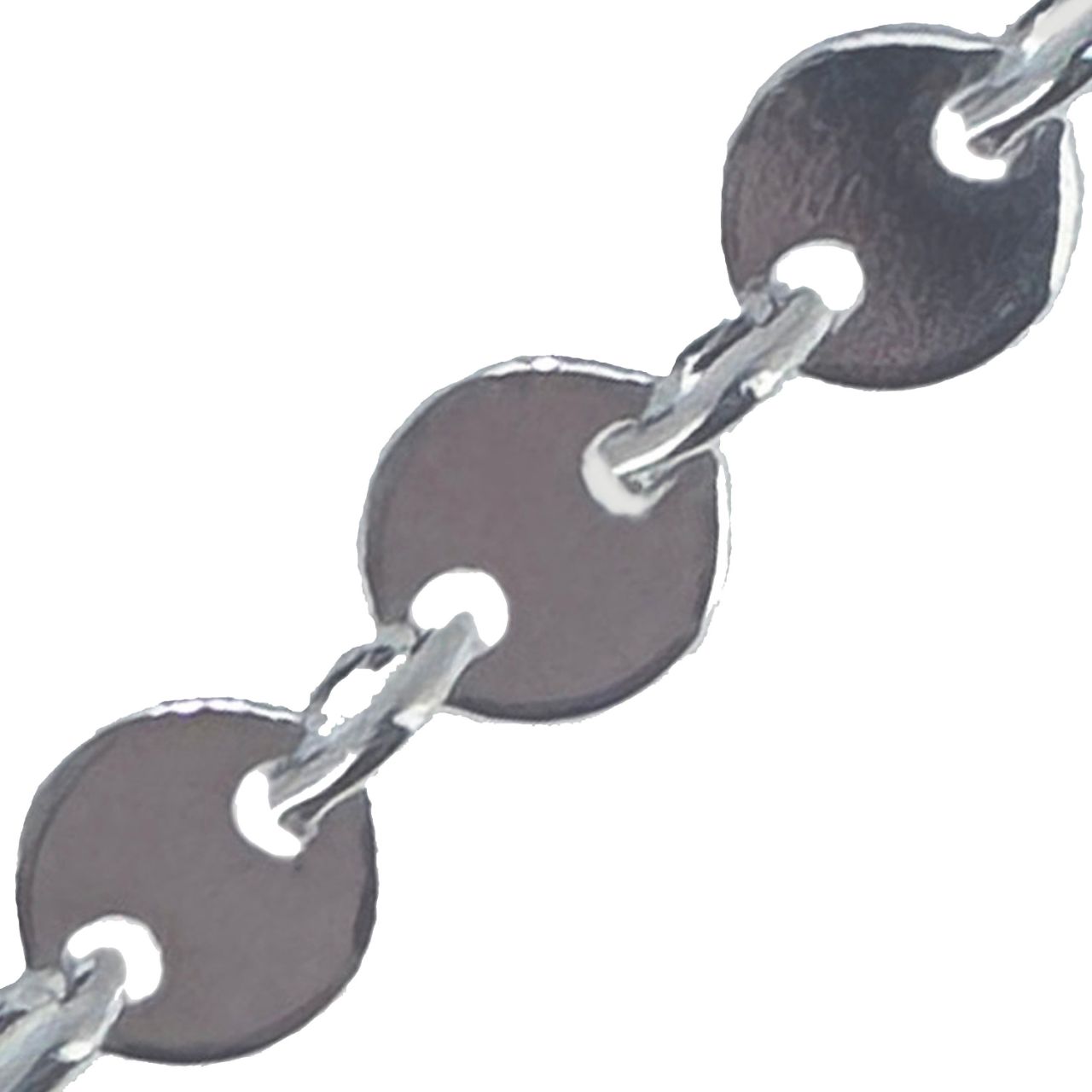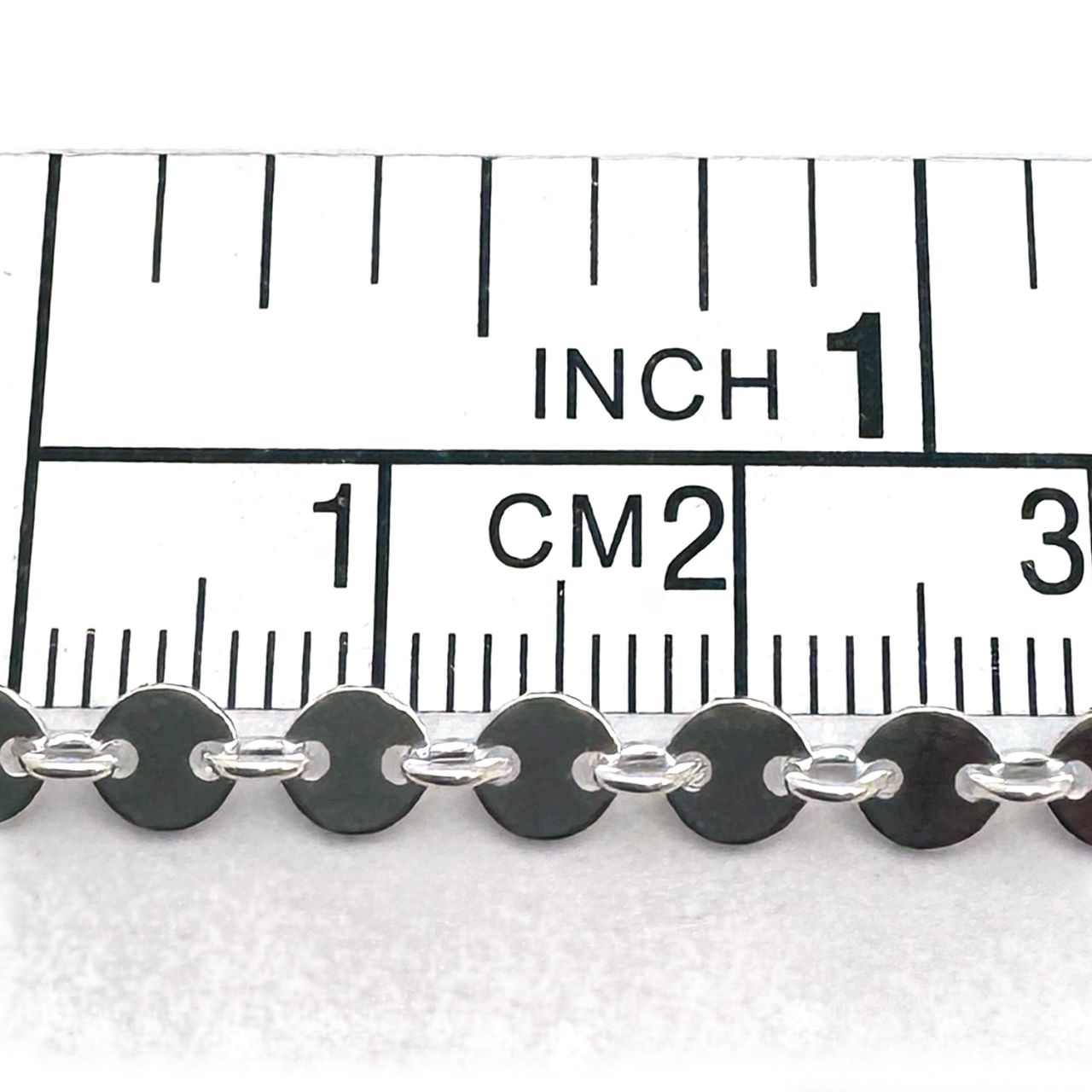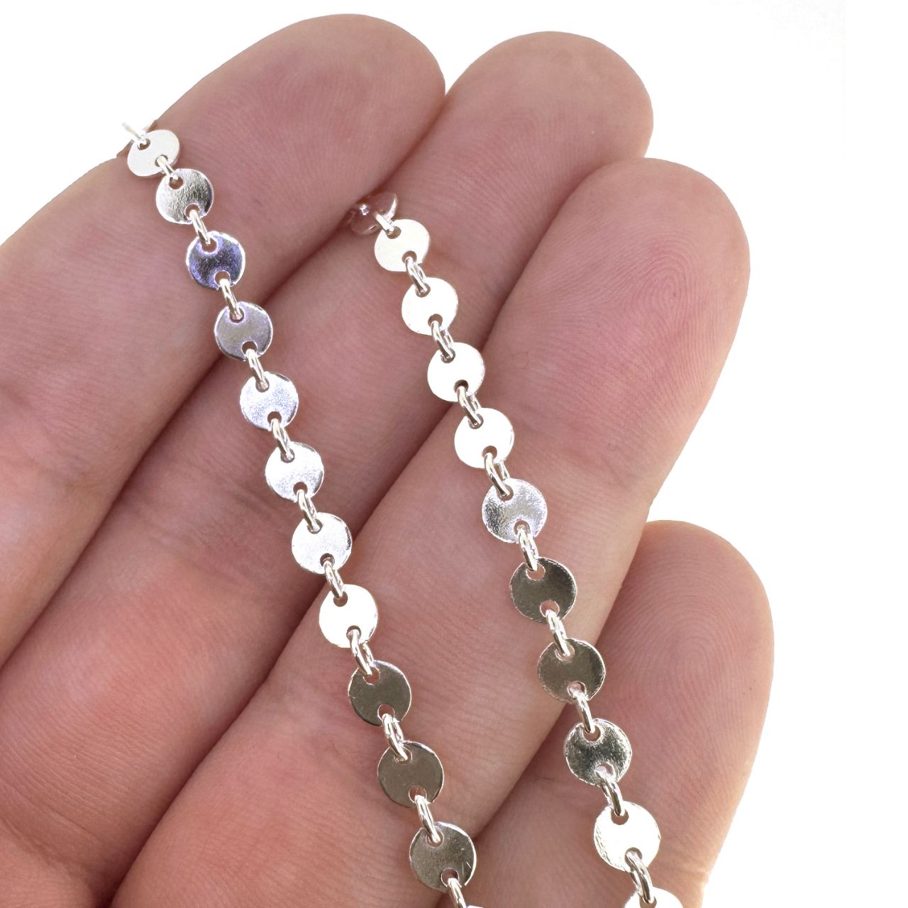 Material: 925 Sterling SilverShape: Round Sequin Disc Component size: disc: 4mm,0.4mm thickness , ring: 24 gauge (0.5mm thickness), 2.5mm Links/Inch: 5 links Weight: 4.53 grams per footOrigin: ItalyJump ring/wire to use: To finish this chain, use up to 19 gauge jump rings. Recommend 20 gauge 4mm.