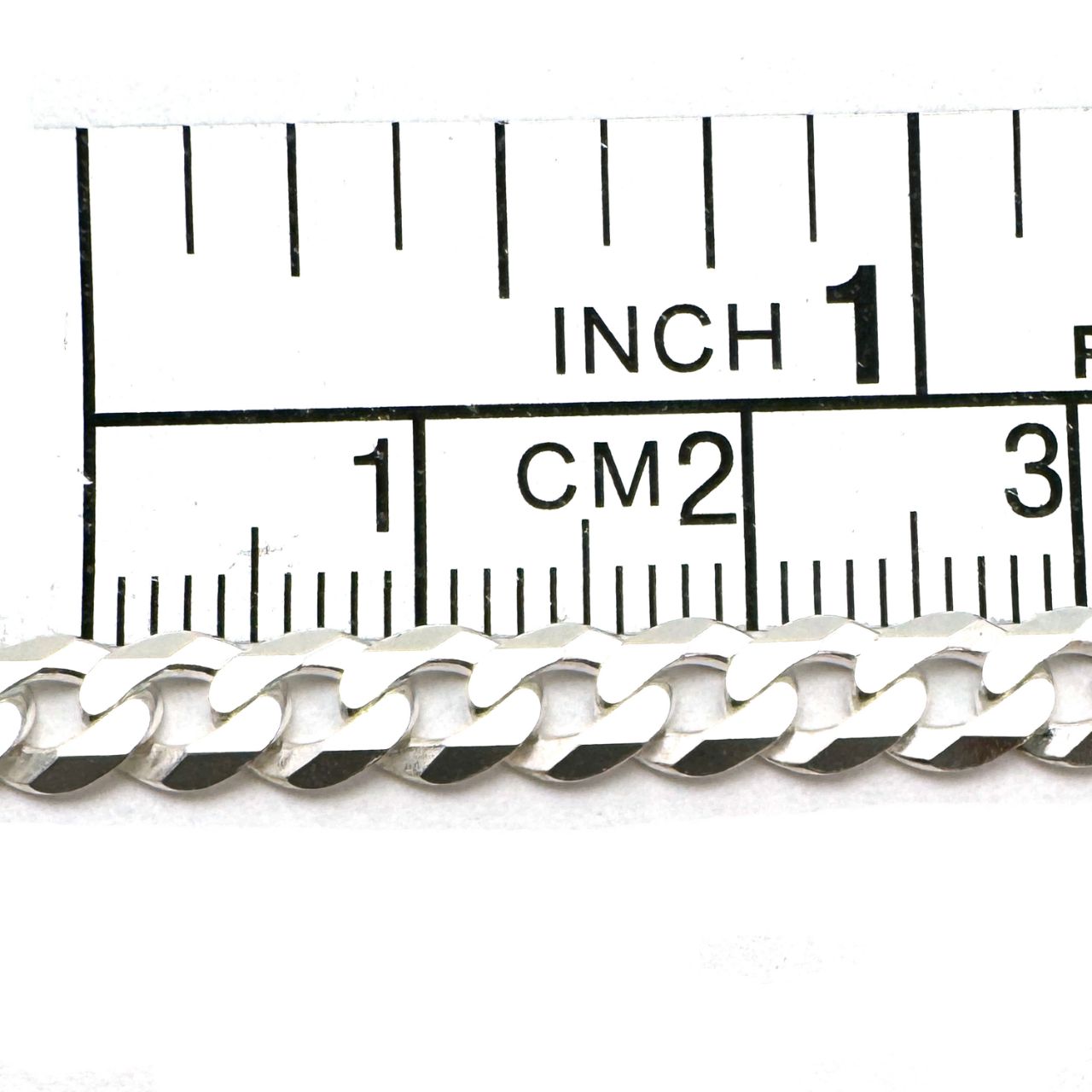 Add to compare list 925 Sterling Silver Diamond Cut Flat Cuban Curb Chain 3mm - (sold per foot) SKU : 101082 OD-4.6mm long by 3mm wide 8 links per inch Log In for Wholesale Prices