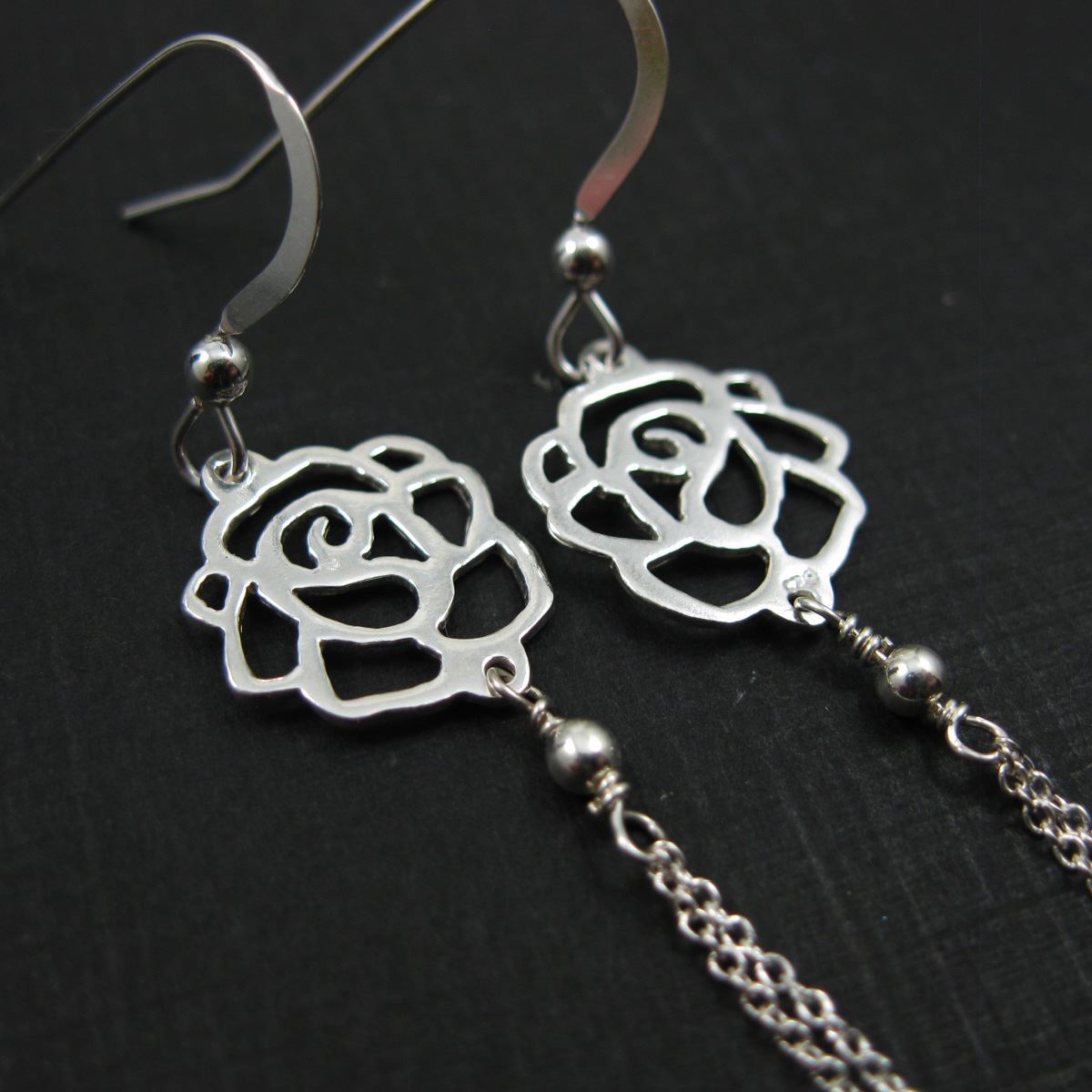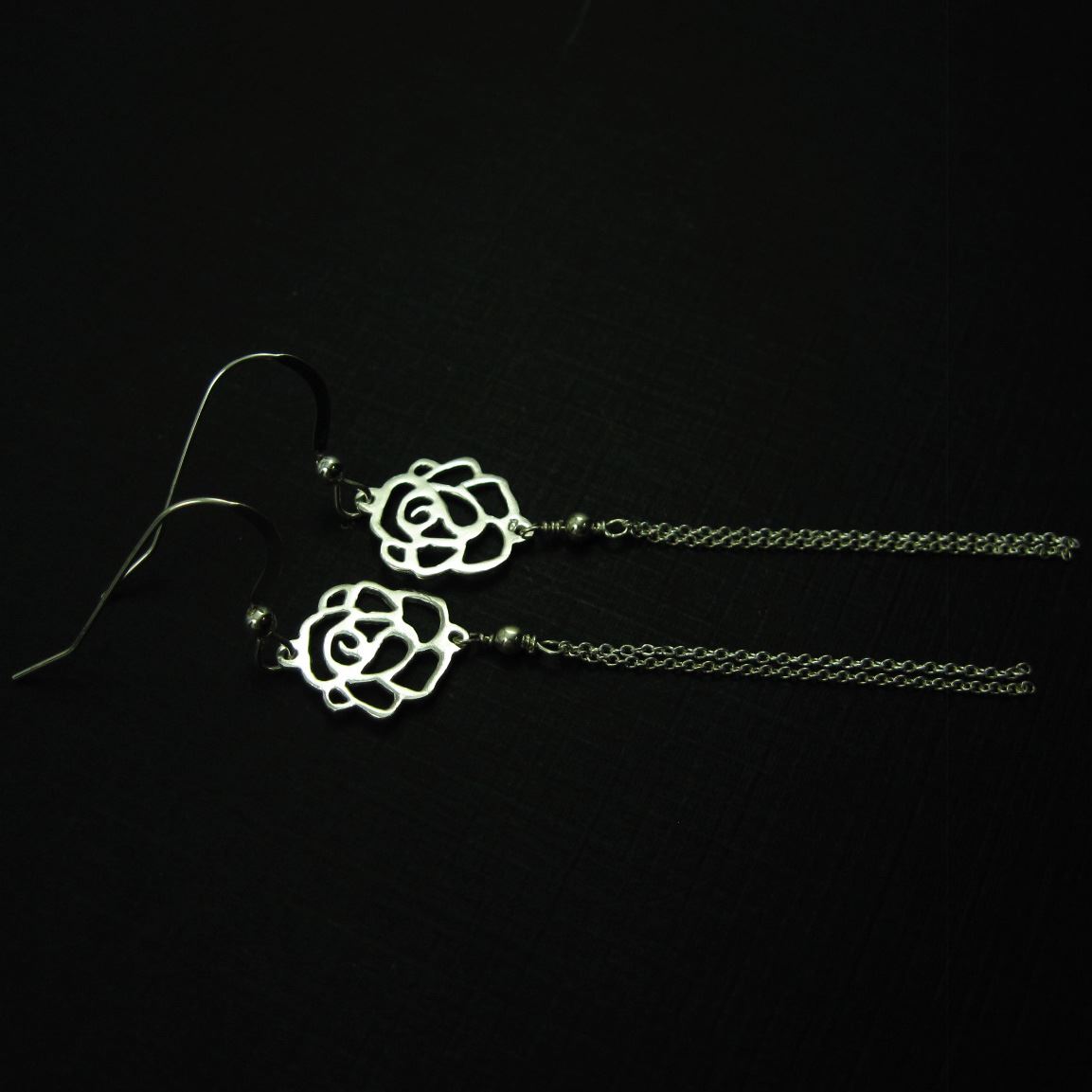 Pendant Description: Sweet rose is wire wrapped and connected to a dangling cable chain, attached tio Sterling Silver ear wire