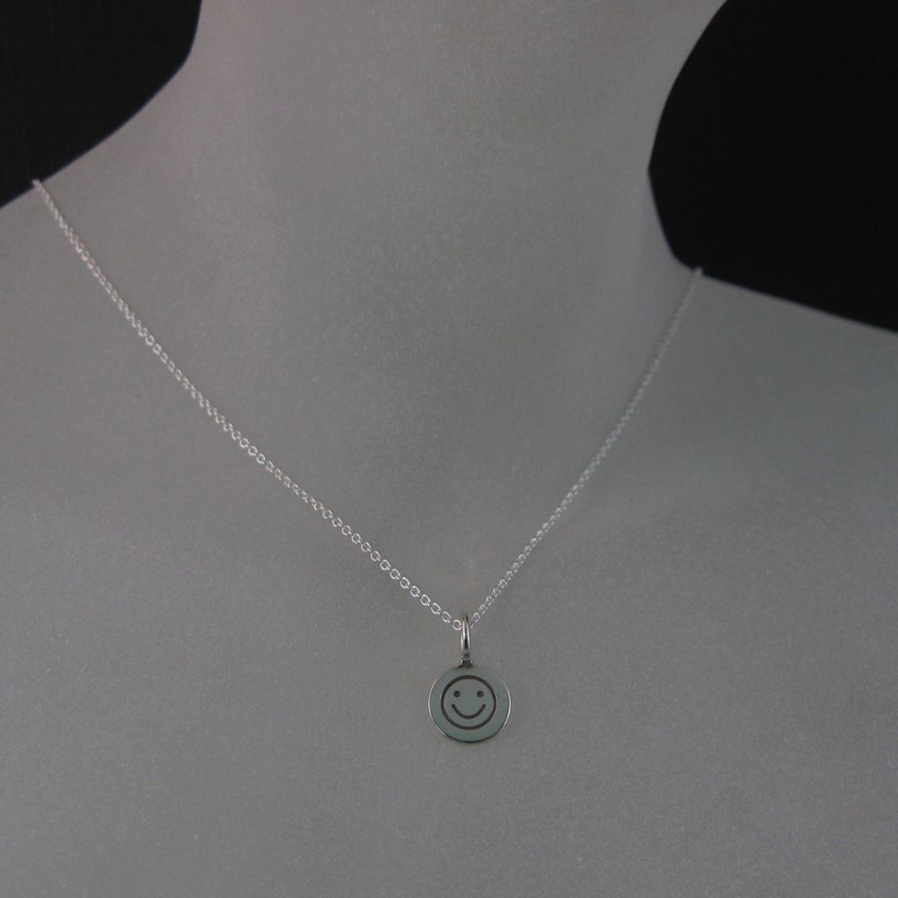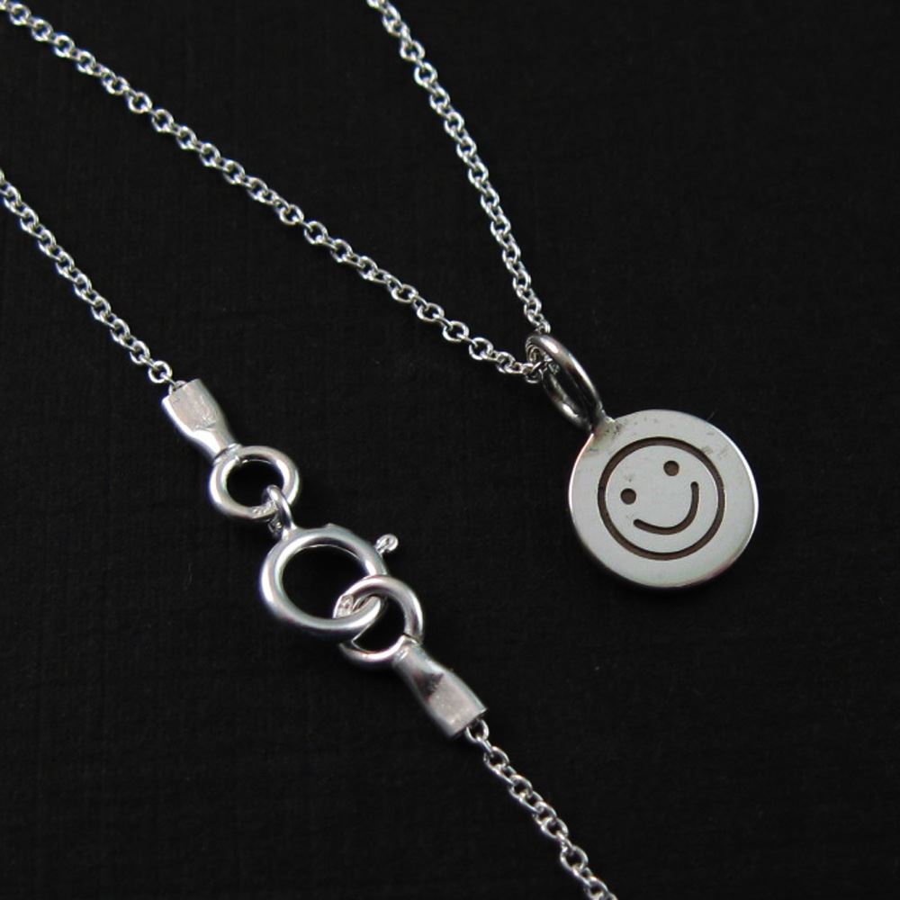 Price: per 1 necklaceMaterial: Solid Genuine .925 Sterling Silver. Description: : Round happy face charm. "925" mark on the back. Tiny plain cable link chain.Length: 16 to 24 inches. If you would like a different length please contact the seller. Charm Measurement: 12mm long with ring, 8mm long without ring, 8mm wide, 1mm thick.