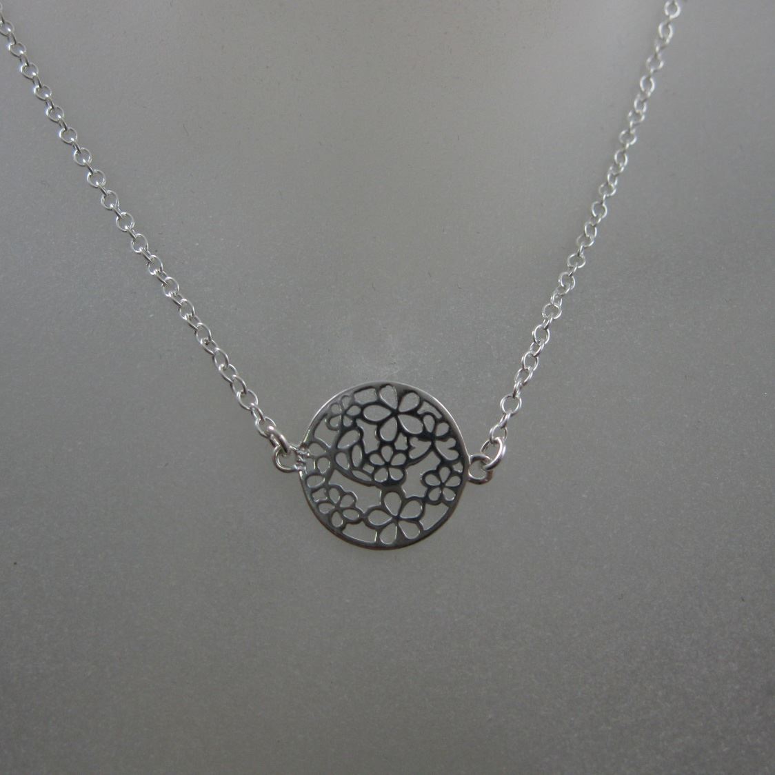 Price: per 1 necklaceMaterial: Solid Genuine .925 Sterling Silver. Description: : Round connector with flower filigree. Tiny plain cable link chain.Length: 16 to 24 inches. If you would like a different length please contact the seller. Charm Measurement: 15mm long, 19.5mm wide (including connector rings), 1mm thick