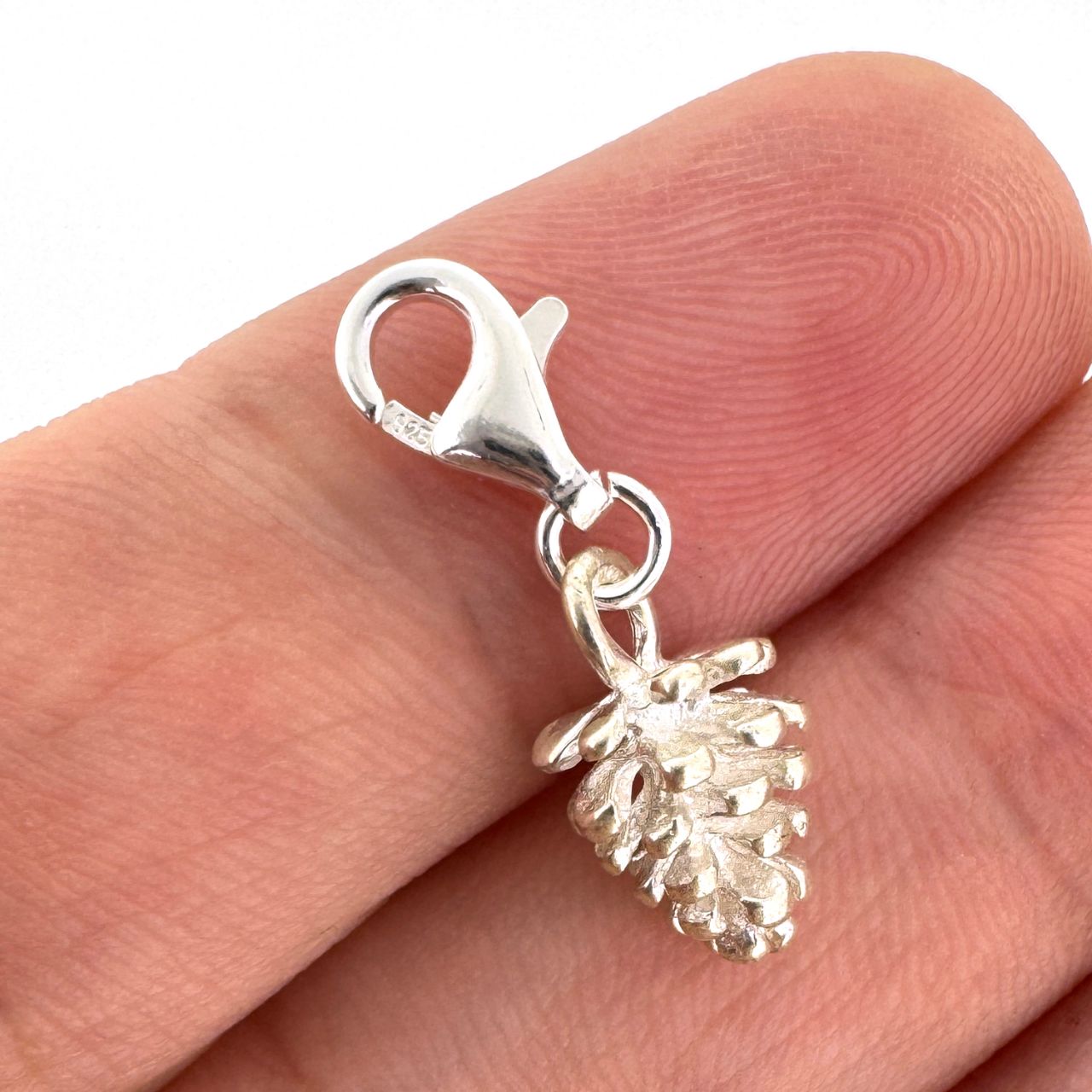 Material: Solid Genuine .925 Sterling Silver. Shape: Pine cone with 8mm Lobster Clasp