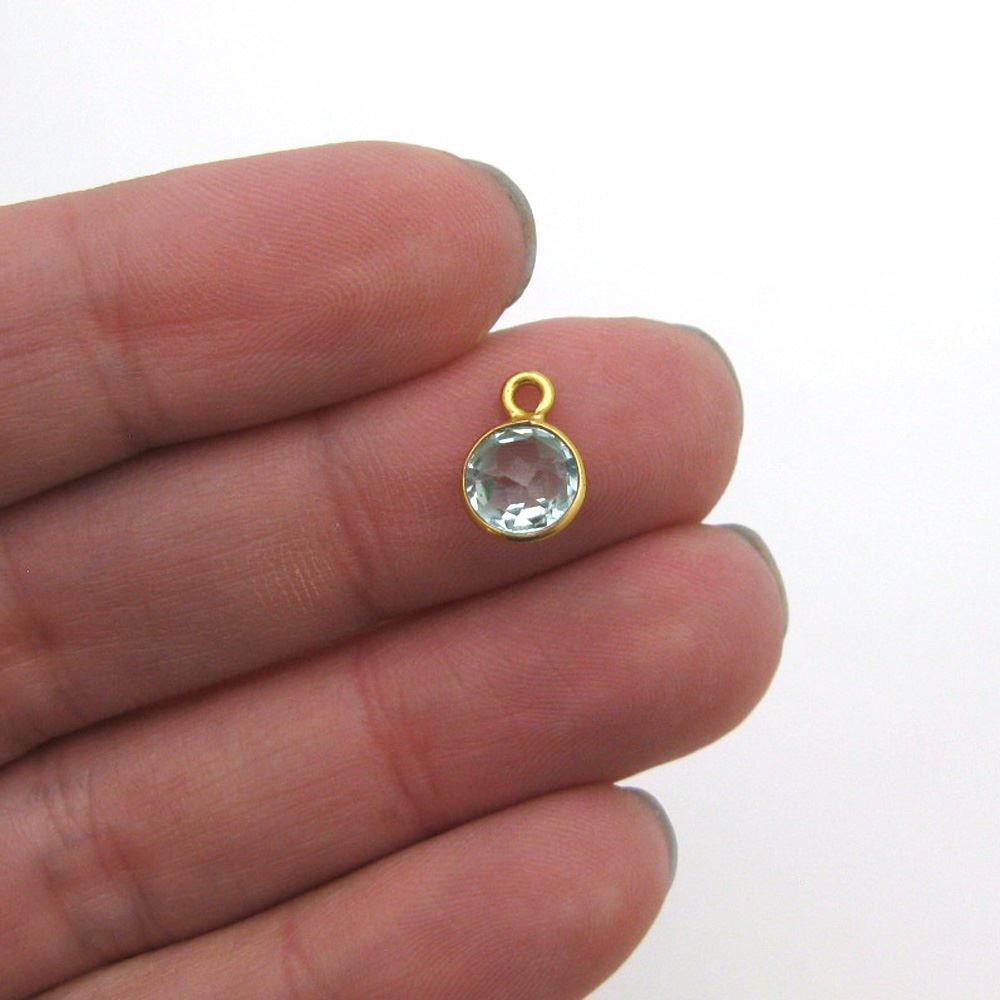 Stone: Aqua QuartzFrame Material: Gold Plated Solid Genuine .925 Sterling Silver. Shape: Tiny Faceted Circle Shape on both sides. Measurement: 7mm, 10mm with hoop, stone size is 6mm. Weight: Ave. 0.3gmsQuantity: 1pc