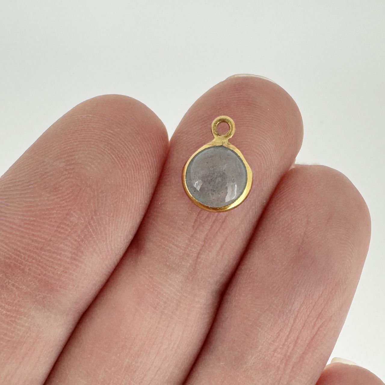 Natural Stone: AquamarineFrame Material: Gold Plated Solid Genuine .925 Sterling Silver. Shape: RoundMeasurement: 7.8mm wide, 10.5mm long, stone size is 7mmRing: 1mm inner diameterQuantity: 1pc