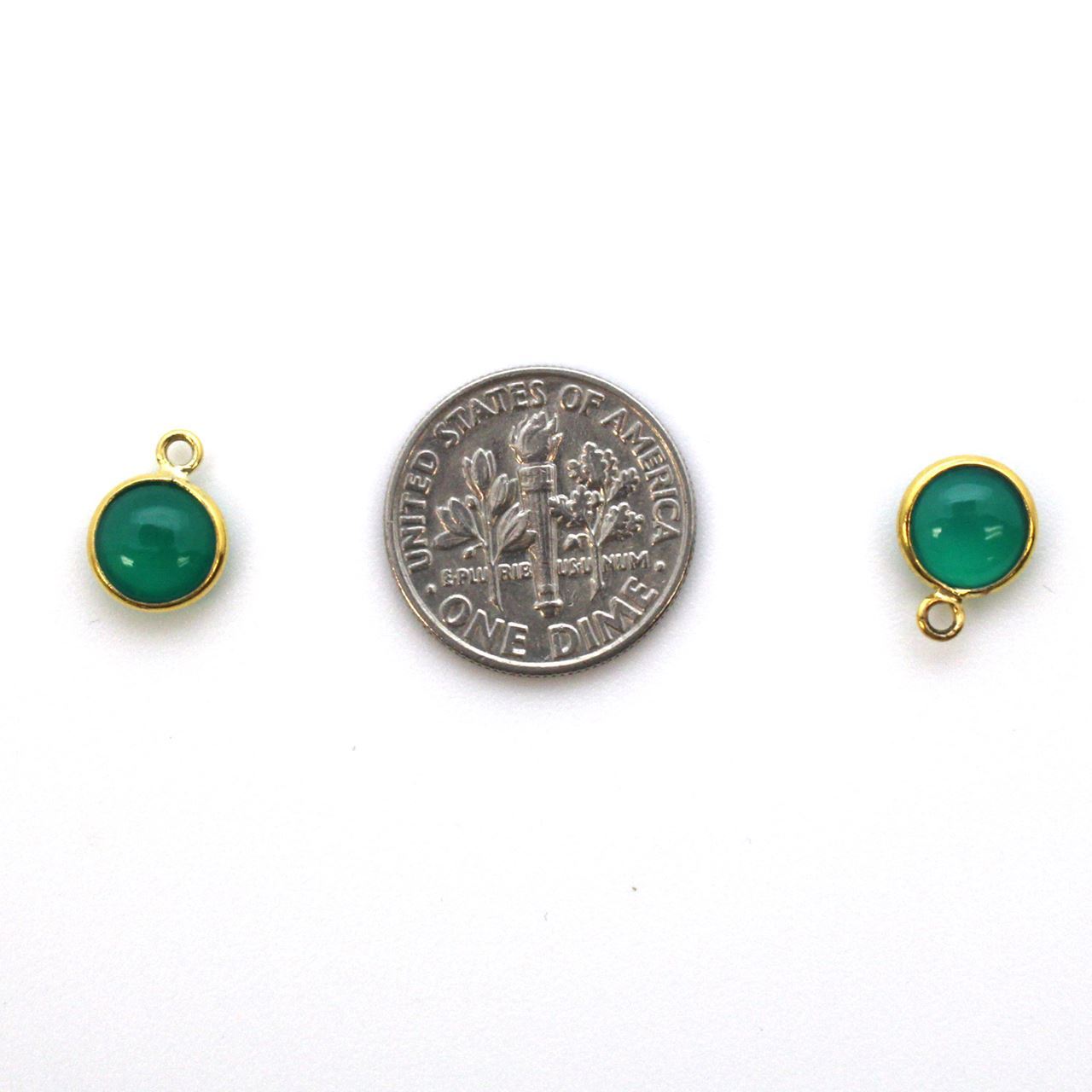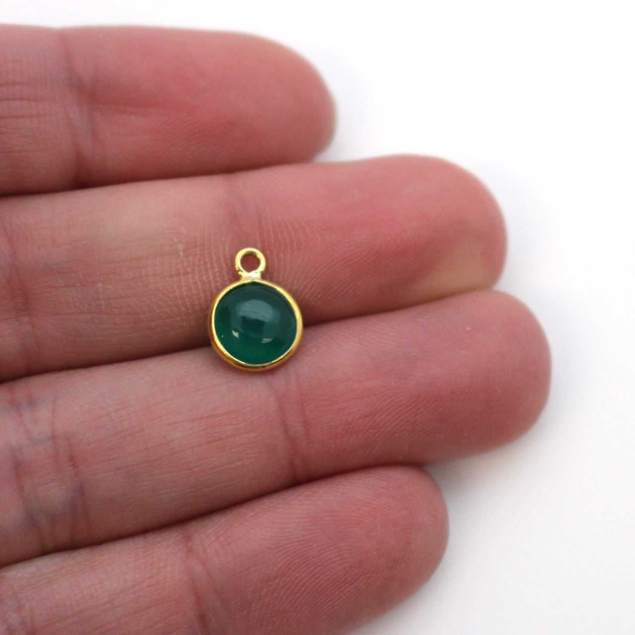 Natural Stone: Green OnyxFrame Material: Gold Plated Solid Genuine .925 Sterling Silver. Shape: RoundMeasurement: 7.8mm wide, 10.5mm long, stone size is 7mmRing: 1mm inner diameterQuantity: 1pc