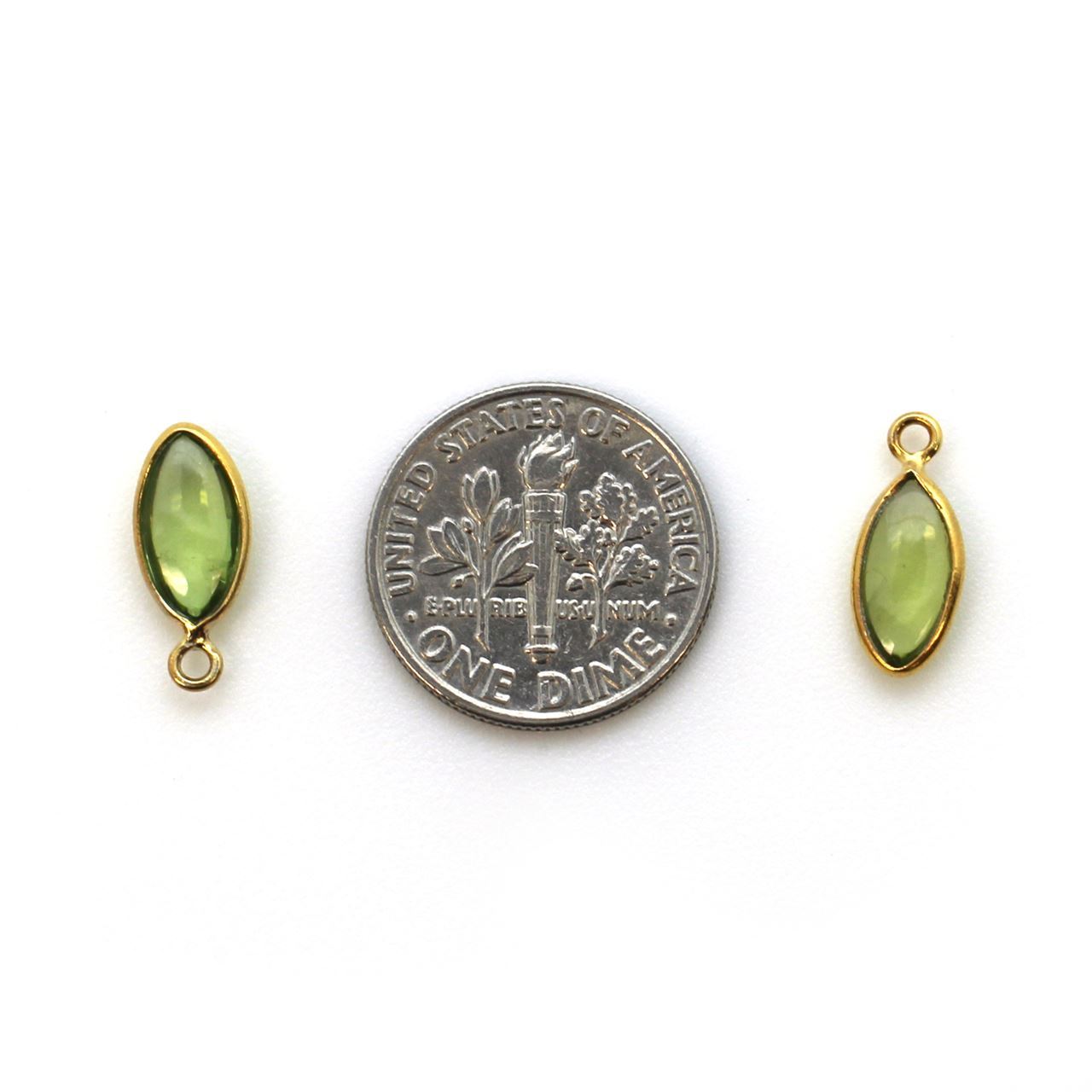 Natural Stone: PeridotFrame Material: Gold Plated Solid Genuine .925 Sterling Silver. Shape: Tiny Marquise. Measurement: 6mm wide, 13mm long, stone size is 5x10mmQuantity: 1pc