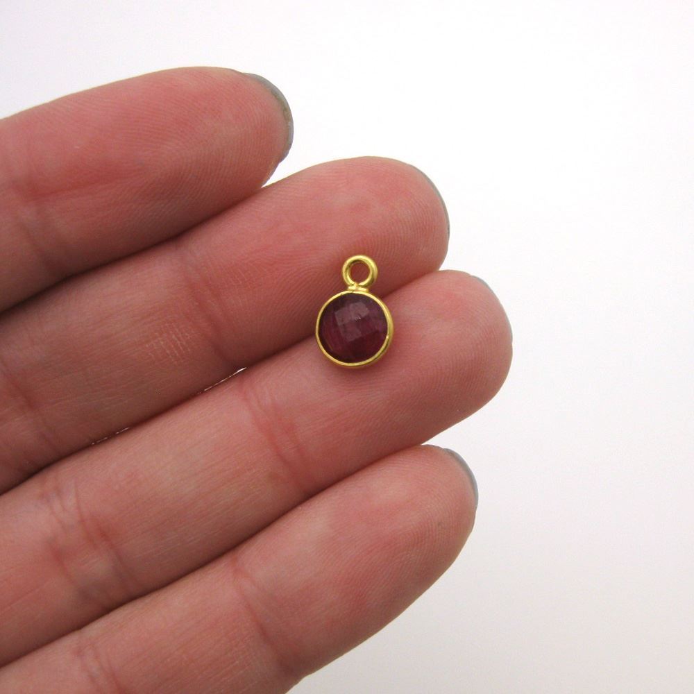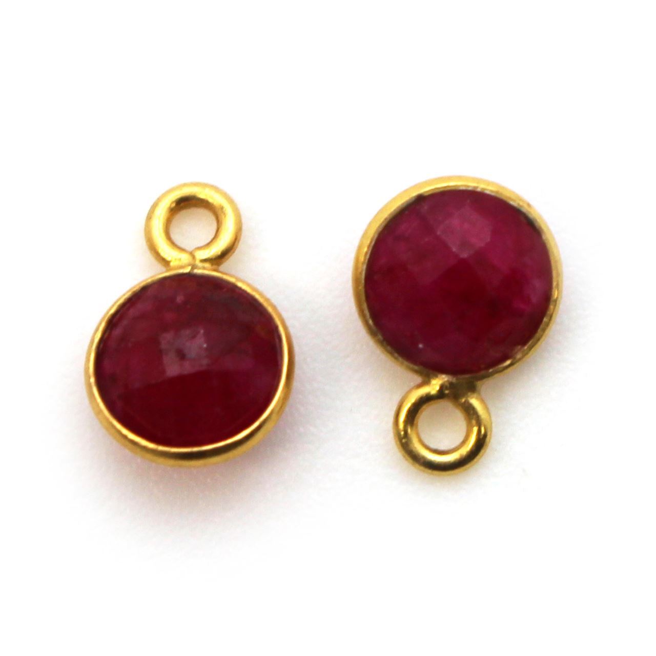 Stone: Ruby DyedFrame Material: Gold Plated Solid Genuine .925 Sterling Silver. Shape: Tiny Faceted Circle Shape on both sides. Measurement: 7mm, 10mm with hoop, stone size is 6mm. Weight: Ave. 0.3gmsQuantity: 1pc