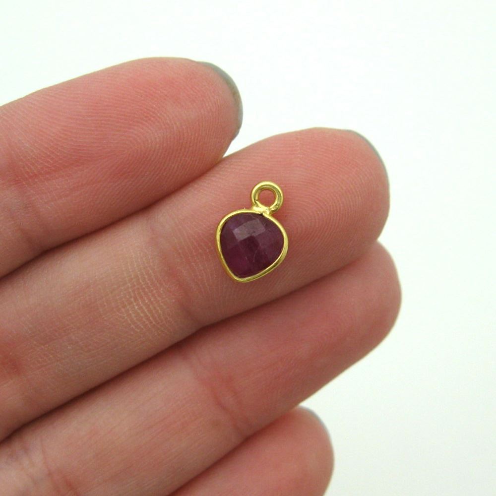 Stone: Ruby DyedFrame Material: Gold over Solid Genuine .925 Sterling Silver. Shape: Tiny Faceted Heart Shape on both sides. Measurement: 10mm long, 7mm wide, stone size is 5.5x6mm. Weight: Ave. 0.3gmsQuantity: 1pc