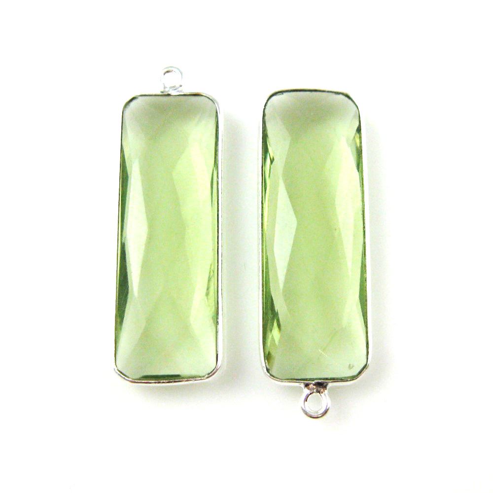 Stone: Green Amethyst QuartzFrame Material: Solid Genuine .925 Sterling Silver. Shape: Faceted elongated rectangle shape on both sides. Measurement: 34mm long 11mm wide, stone size is 30x10mm. Weight: Ave. 3.3 grams per piece.Quantity: 1 pc