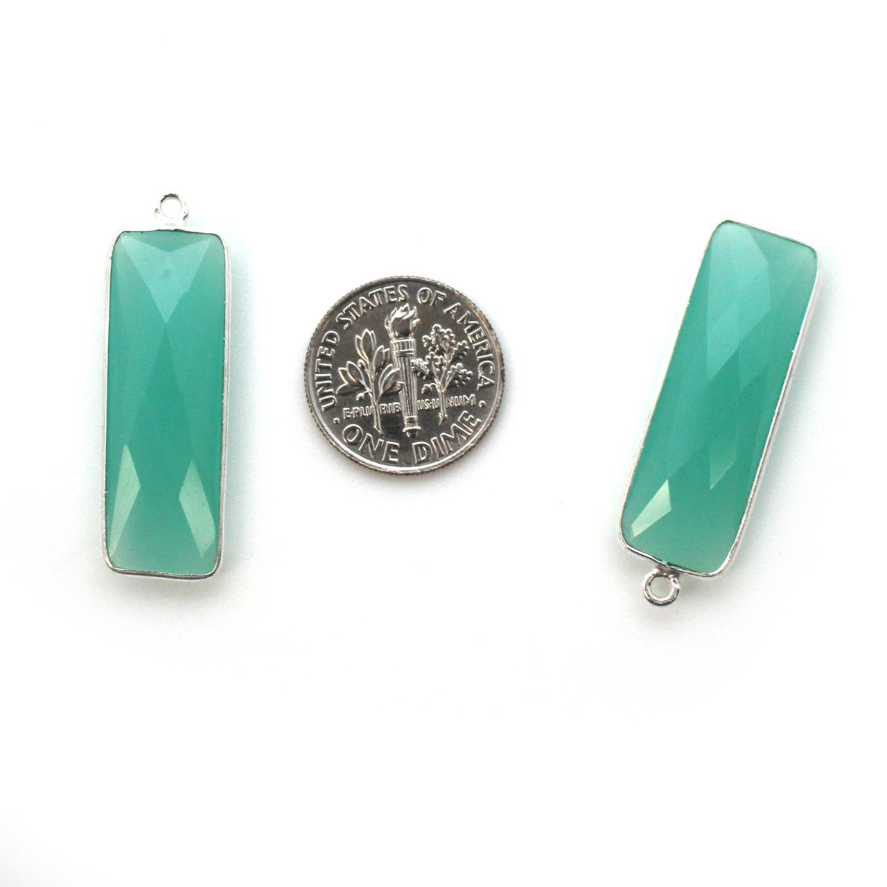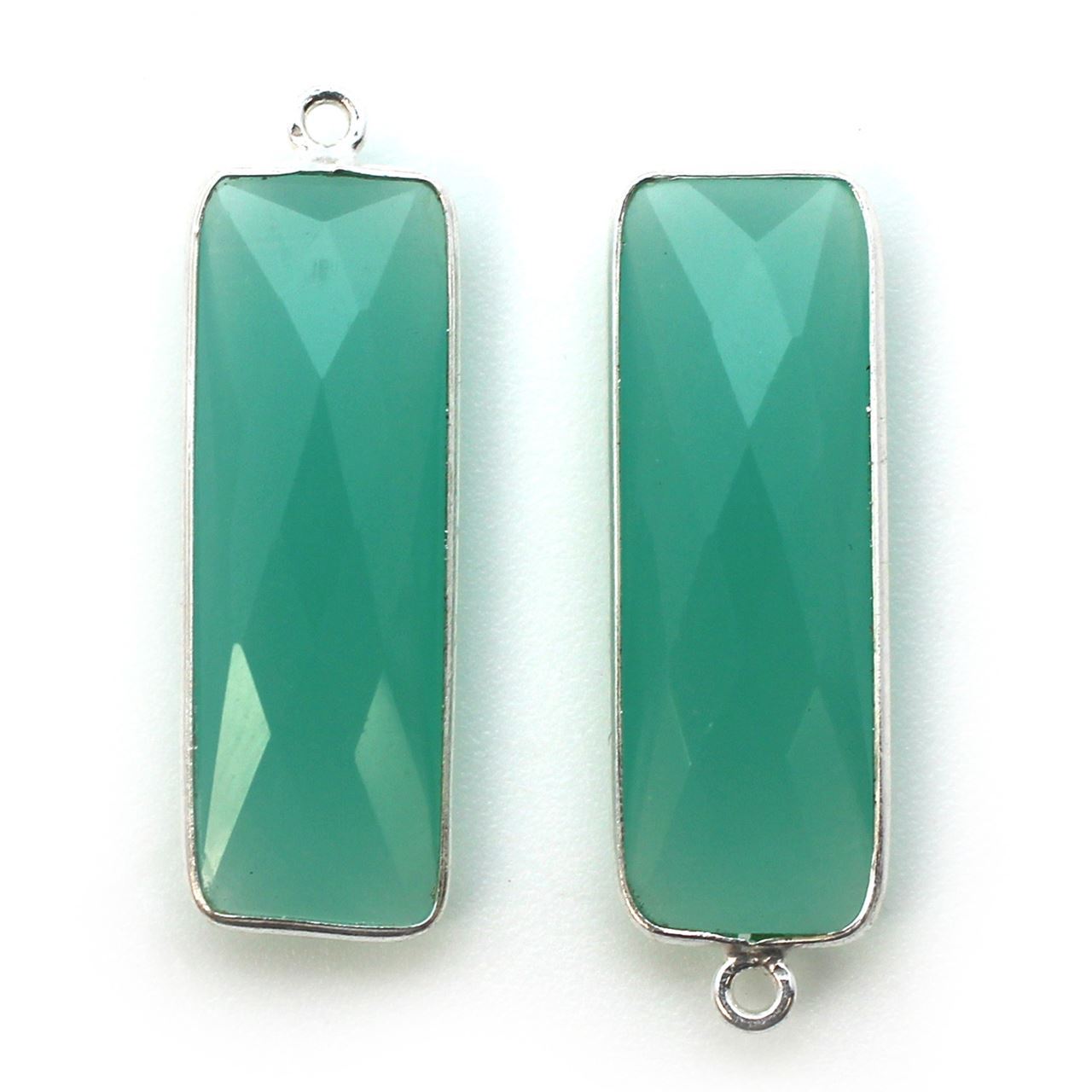 Stone: Peru ChalcedonyFrame Material: Solid Genuine .925 Sterling Silver. Shape: Faceted elongated rectangle shape on both sides. Measurement: 34mm long 11mm wide, stone size is 30x10mm. Weight: Ave. 3.3 grams per piece.Quantity: 1 pc