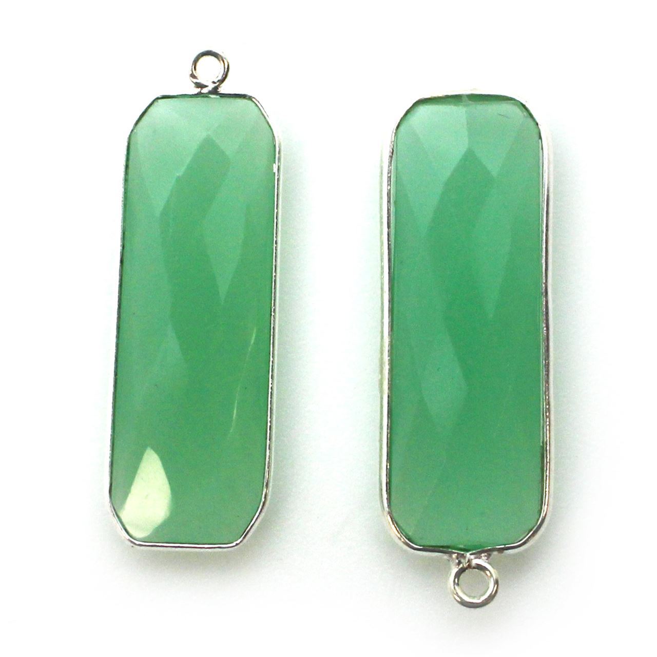 Stone: Prehnite ChalcedonyFrame Material: Solid Genuine .925 Sterling Silver. Shape: Faceted elongated rectangle shape on both sides. Measurement: 34mm long 11mm wide, stone size is 30x10mm. Weight: Ave. 3.3 grams per piece.Quantity: 1 pc