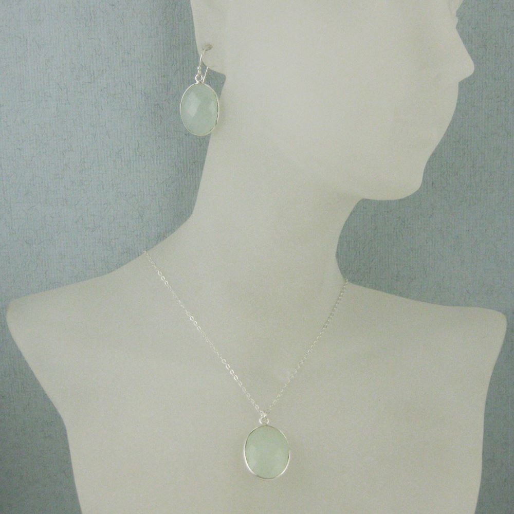 Bezel Gem Oval Pendant Necklace & Earrings - Sterling Silver-Aqua Chalcedony (16-24")