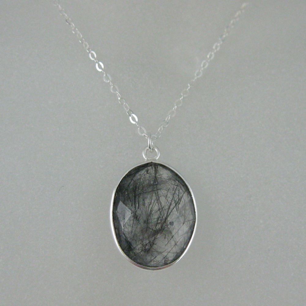 Stone: Black Rutilated QuartzStone Shape: Faceted oval shape on both sides. Pendant Measurement: 21mm long, stone is 14x18mm.