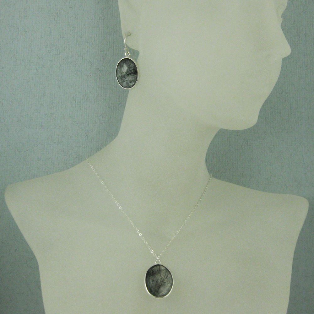 Bezel Gem Oval Pendant Necklace & Earrings - Sterling Silver-Black Rutilated Quartz (16-24")