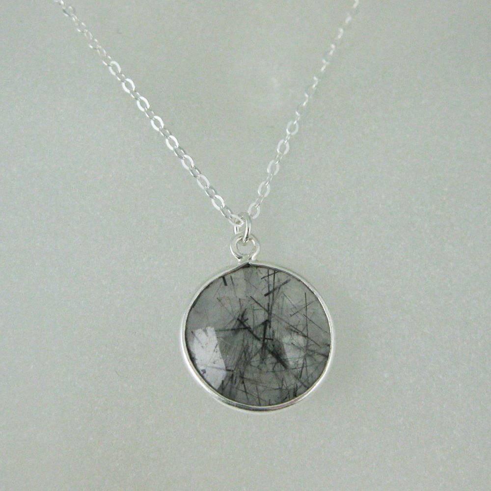 Stone: Black Rutilated Quartz Stone Shape: Faceted coin shape on both sides. Pendant Measurement: 19mm long, stone is 14mm