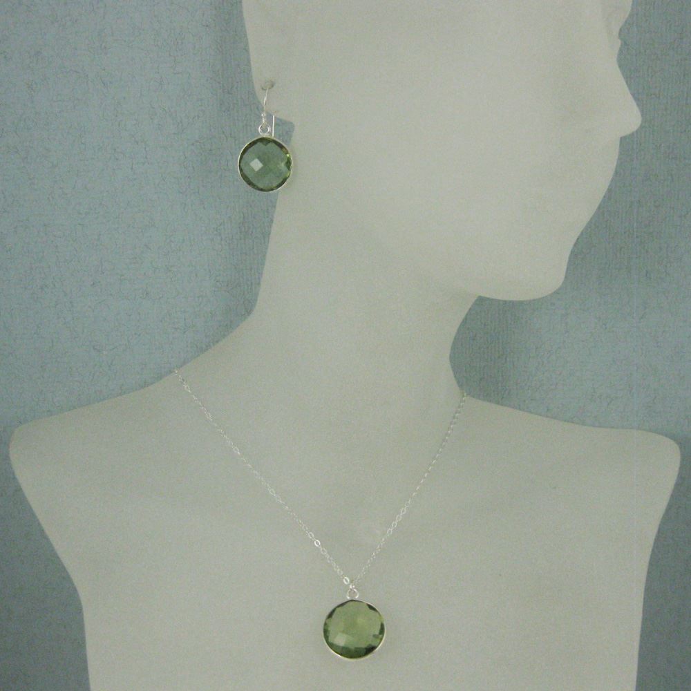 Bezel Gem Round Pendant Necklace & Earrings-Sterling Silver-Green Amethyst Quartz (16-24")