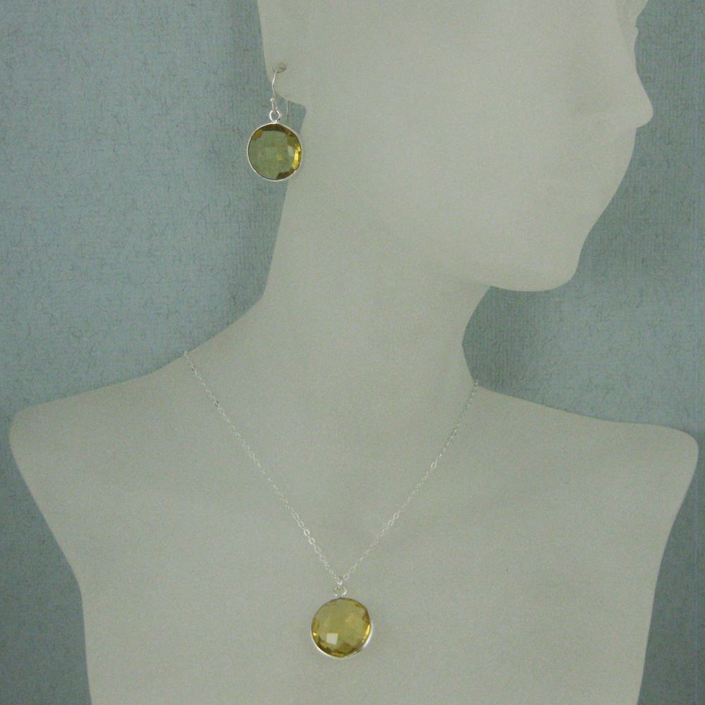 Bezel Gem Round Pendant Necklace & Earrings-Sterling Silver-Lemon Quartz (16-24")