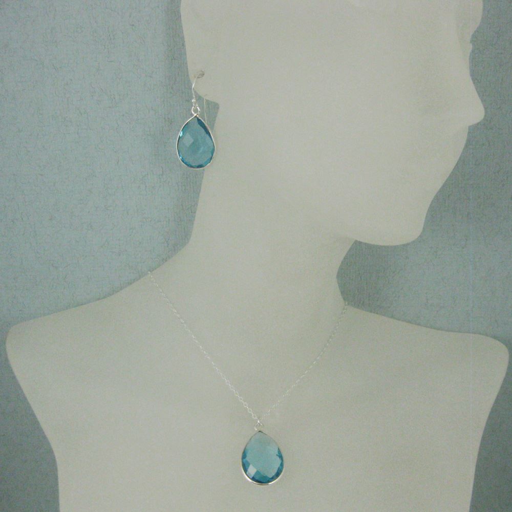 Bezel Gem Tear Pendant Necklace & Earrings - Sterling Silver-Blue Topaz (16-24")