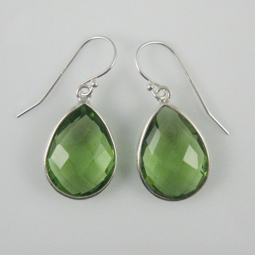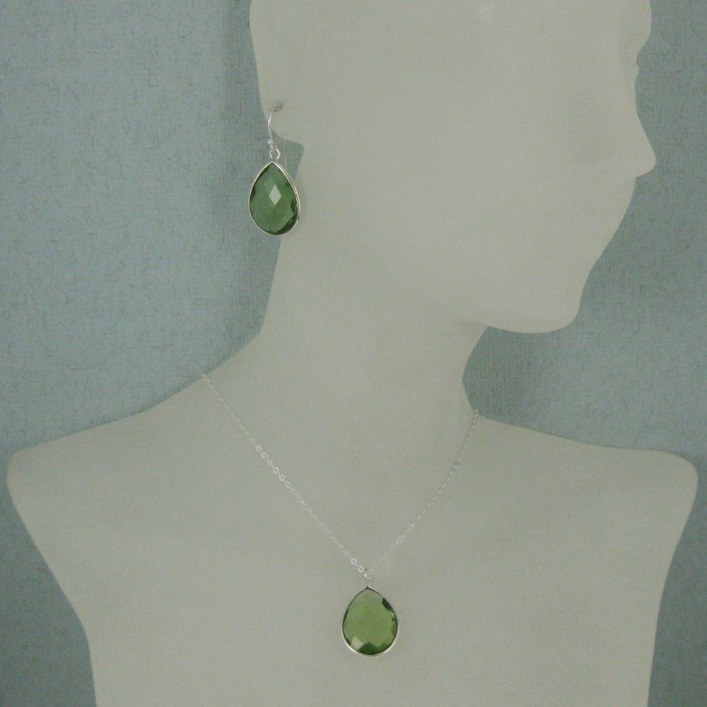 Bezel Gem Tear Pendant Necklace & Earrings - Sterling Silver-Green Amethyst Quartz (16-24")