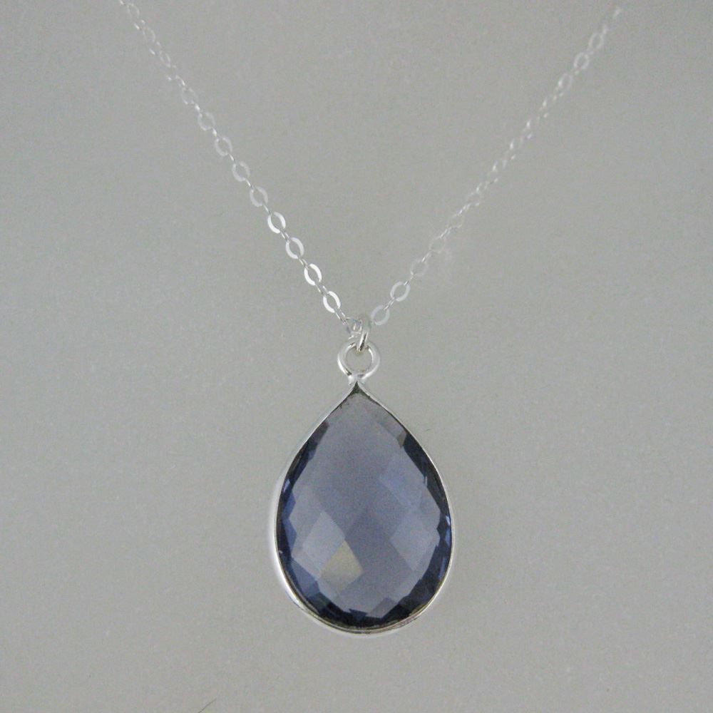 Bezel Gem Tear Pendant Necklace & Earrings - Sterling Silver-Iolite Quartz (16-24")