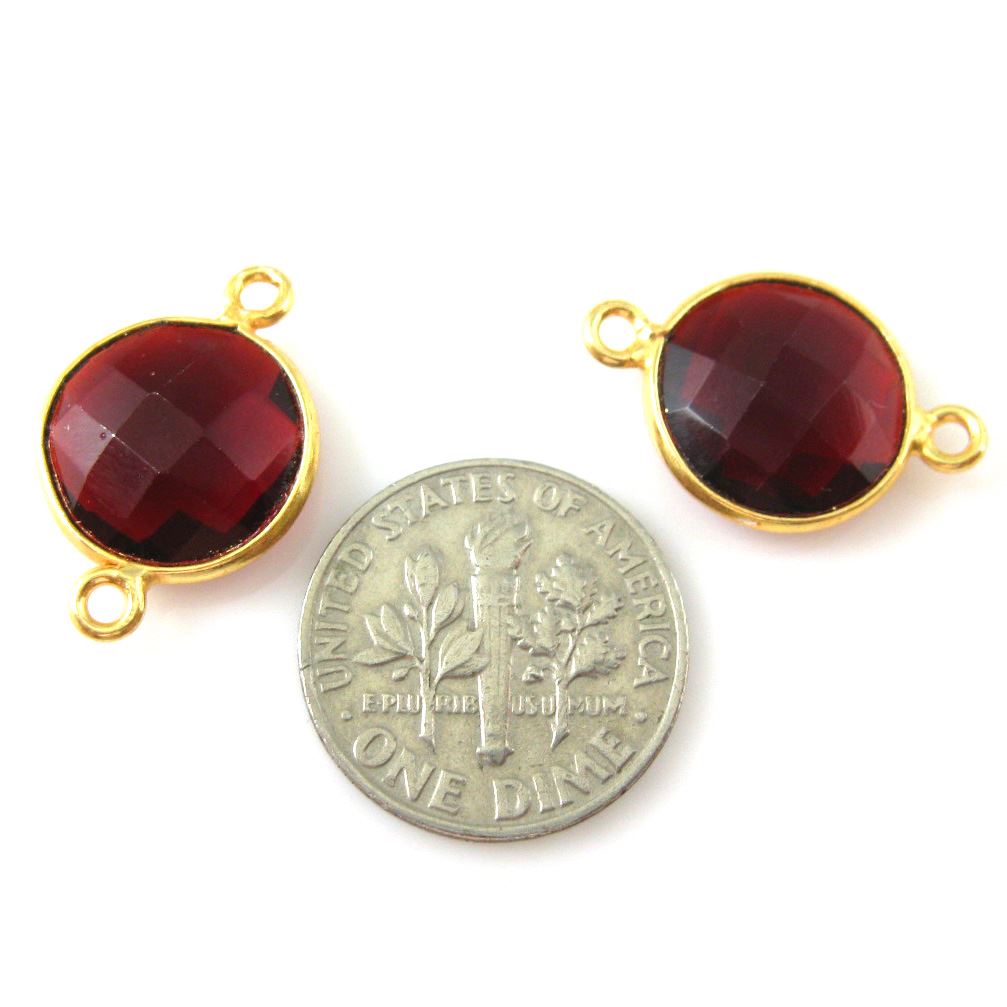 Stone: Garnet QuartzFrame Material: 22K Gold plated over Solid Genuine .925 Sterling Silver. Shape: Faceted coin on both sides Measurement: 20mm with both rings, stone is 12mm Weight: 1.3 grams per piece.