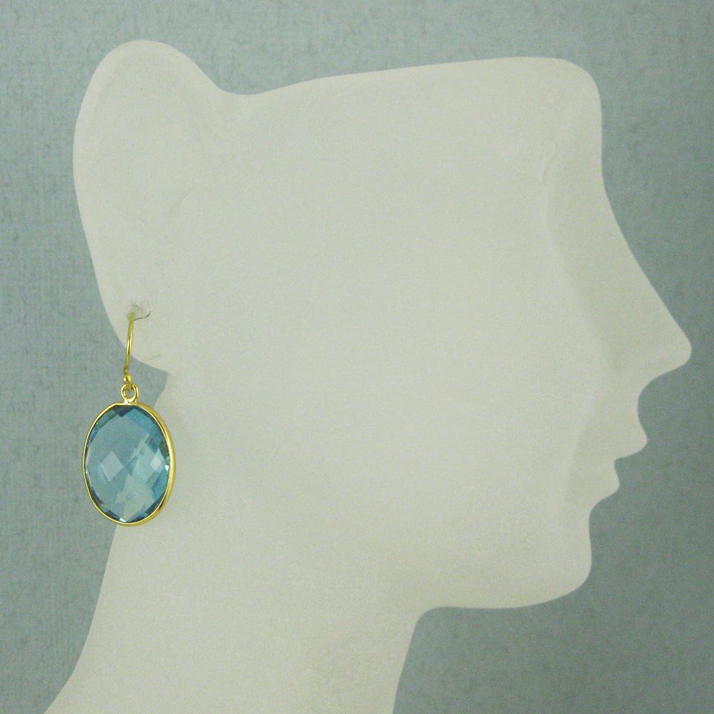 Bezel Gemstone Oval Pendant Earrings - Gold Plated Hooks - Blue Topaz