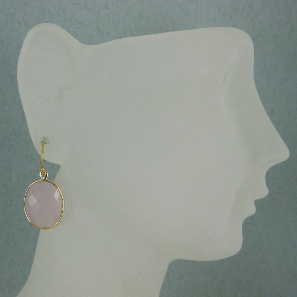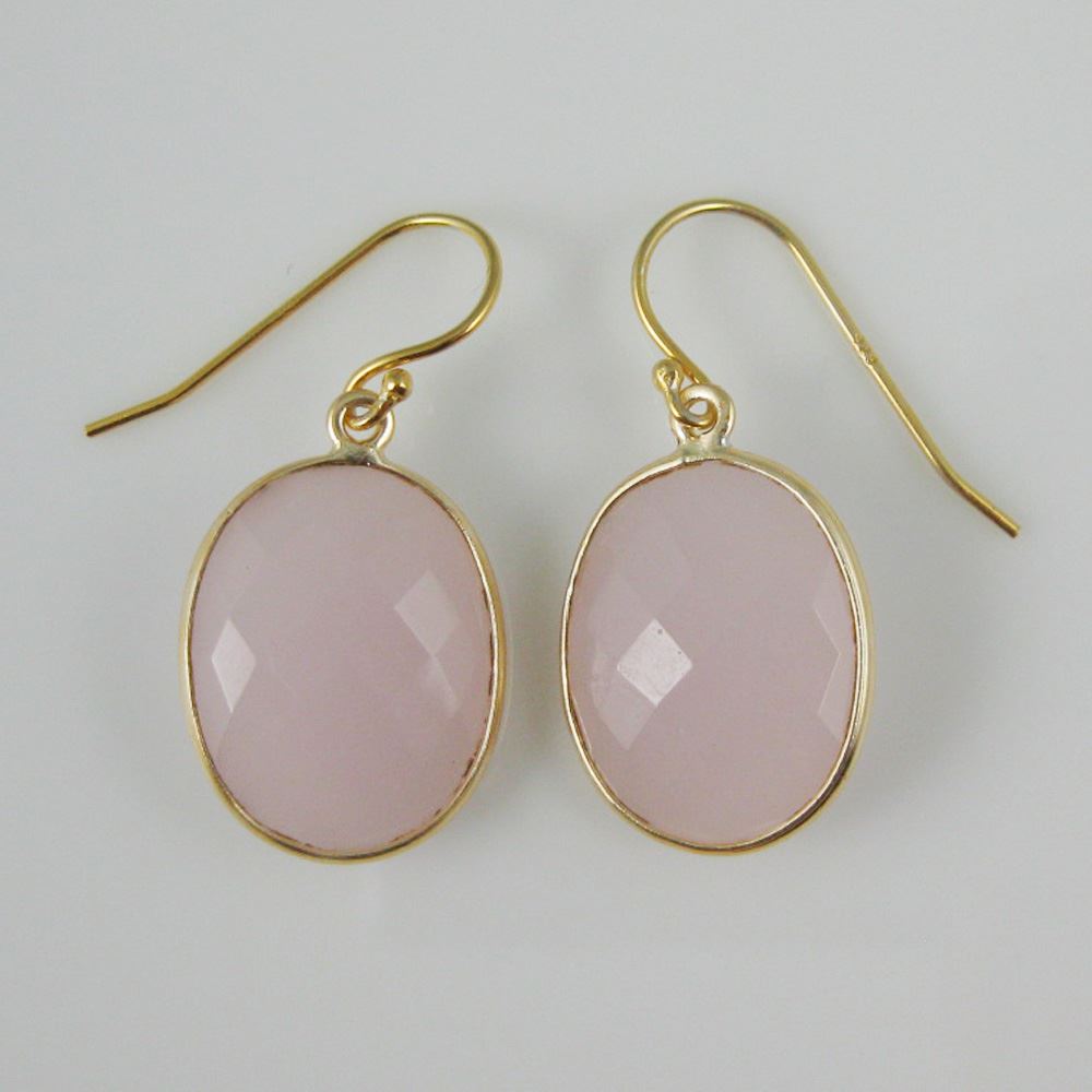 Bezel Gemstone Oval Pendant Earrings - Gold Plated Hooks - Pink Chalcedony