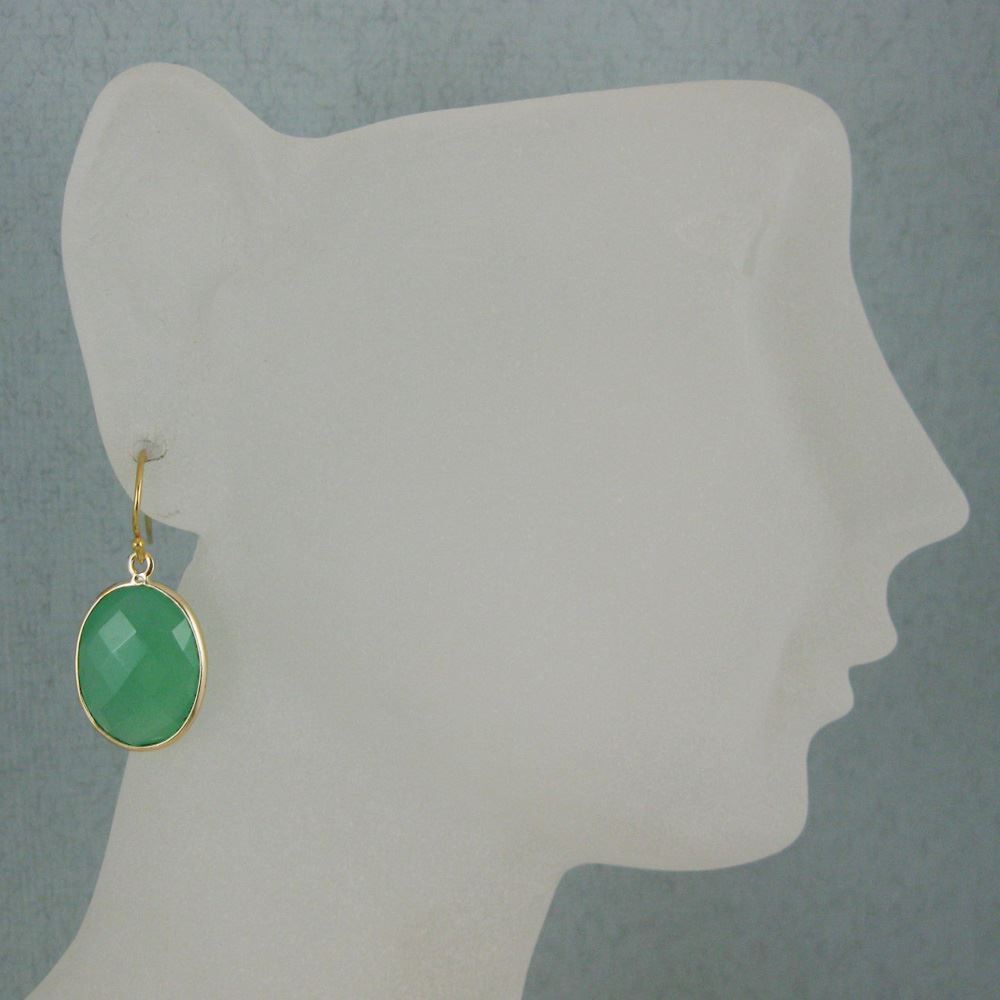 Bezel Gemstone Oval Pendant Earrings - Gold Plated Hooks - Prenite Chalcedony