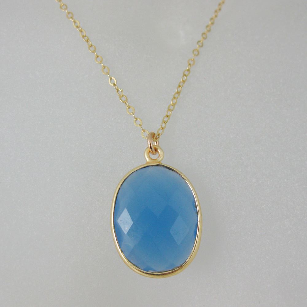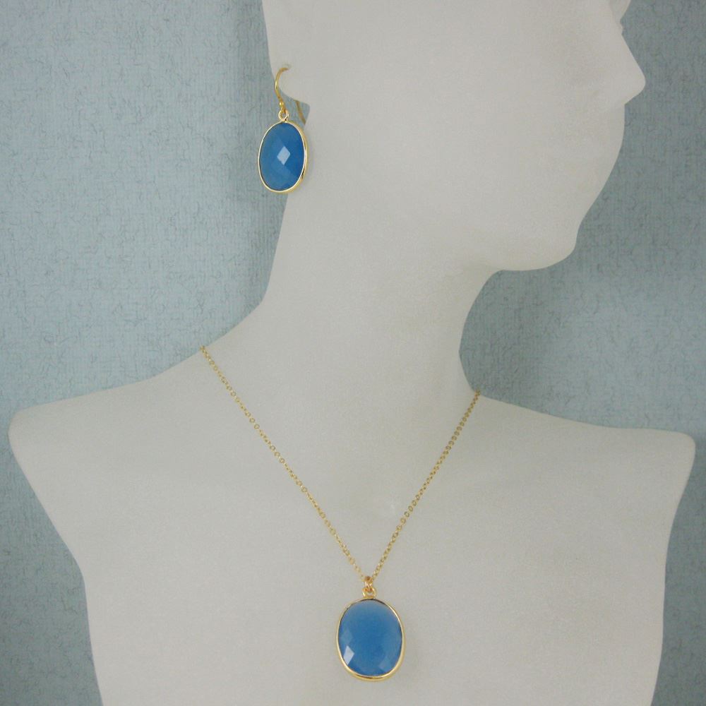 Bezel Gemstone Oval Pendant Necklace & Earrings-Gold Plated-Blue Chalcedony (16-24")