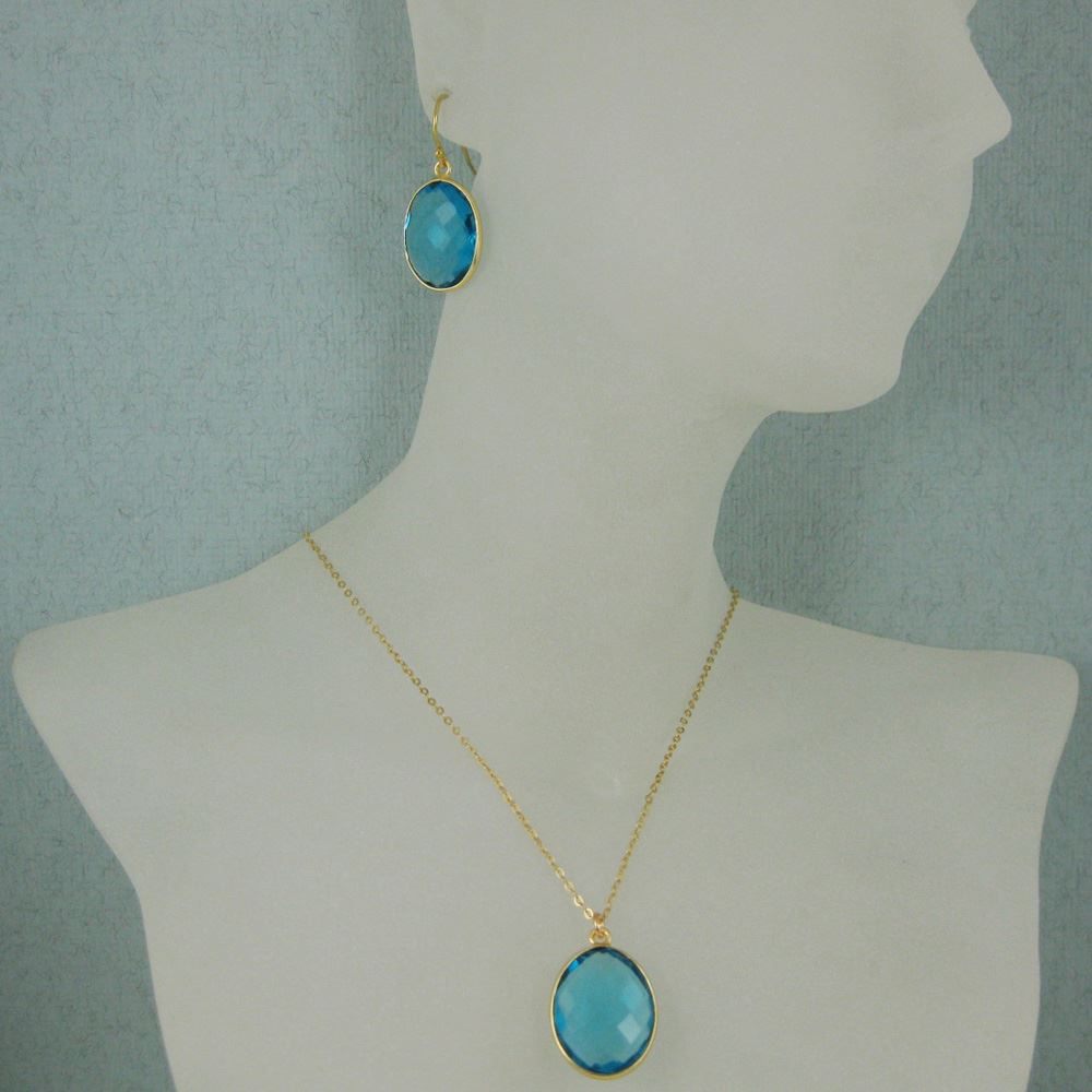 Bezel Gemstone Oval Pendant Necklace & Earrings-Gold Plated-Blue Quartz (16-24")