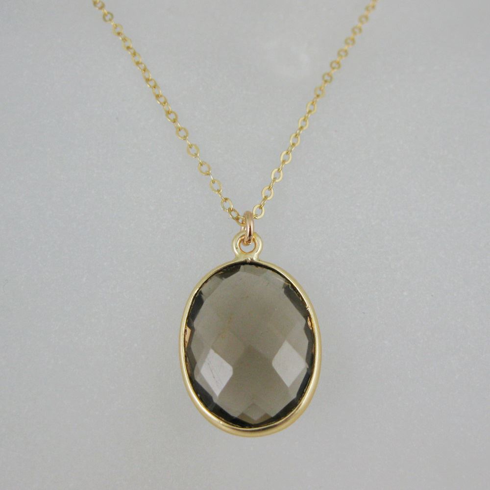 Bezel Gemstone Oval Pendant Necklace & Earrings-Gold Plated-Smoky Quartz (16-24")