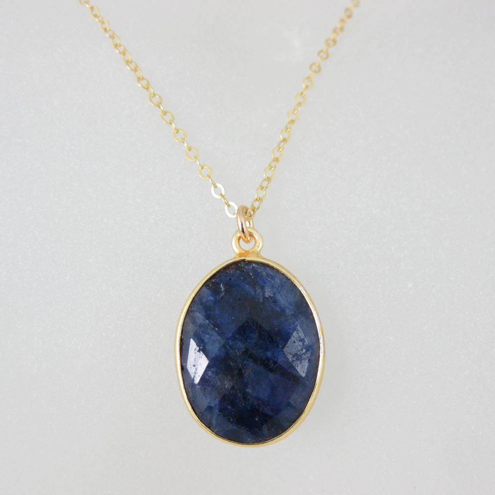 Bezel Gemstone Oval Pendant Necklace - Gold Plated Chain - Blue Sapphire Dyed (16-24")