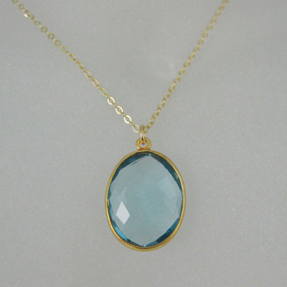Bezel Gemstone Oval Pendant Necklace - Gold Plated Chain - Blue Topaz (16-24")