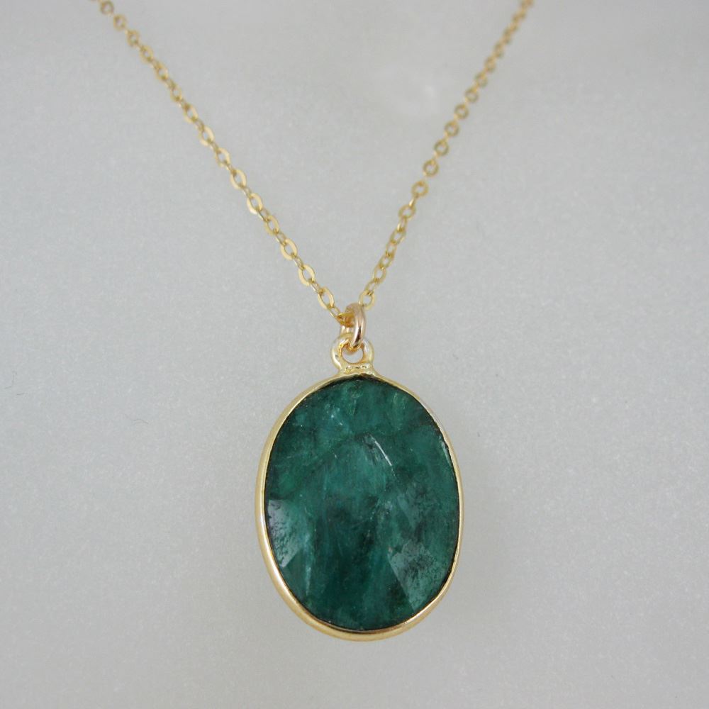 Bezel Gemstone Oval Pendant Necklace - Gold Plated Chain - Emerald Dyed (16-24")