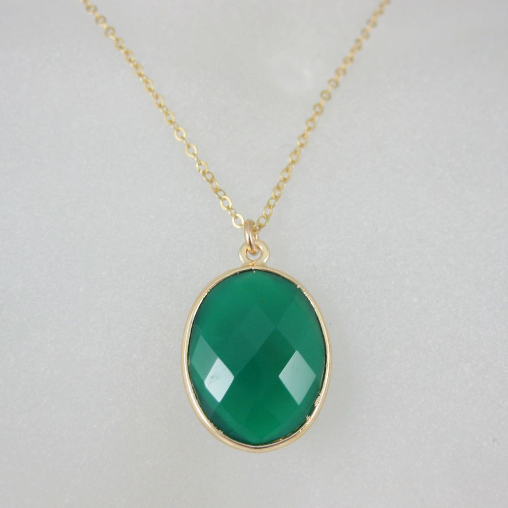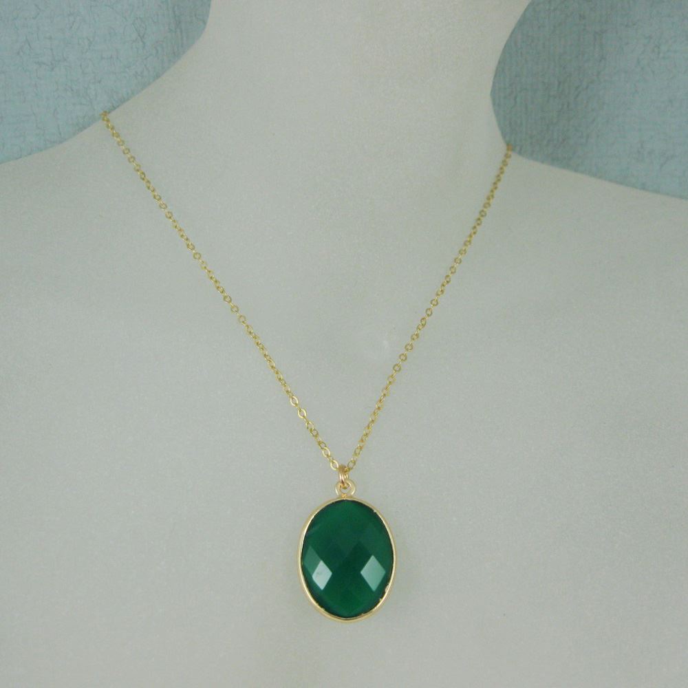 Bezel Gemstone Oval Pendant Necklace - Gold Plated Chain - Green Onyx (16-24")