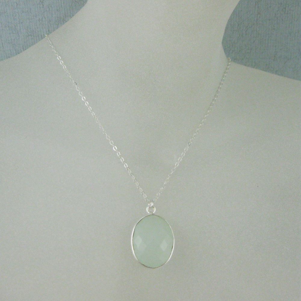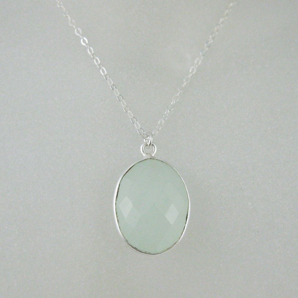Bezel Gemstone Oval Pendant Necklace - Silver Sterling Chain - Aqua Chalcedony (16-24")