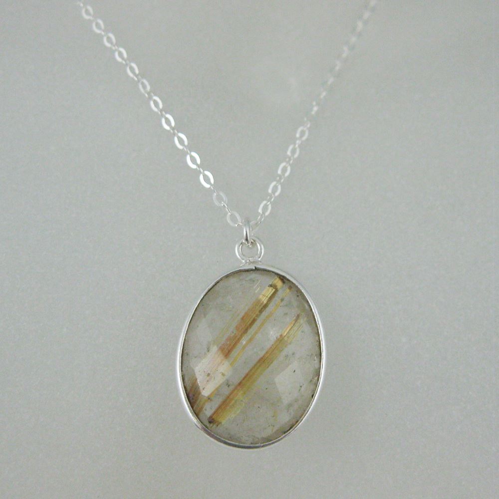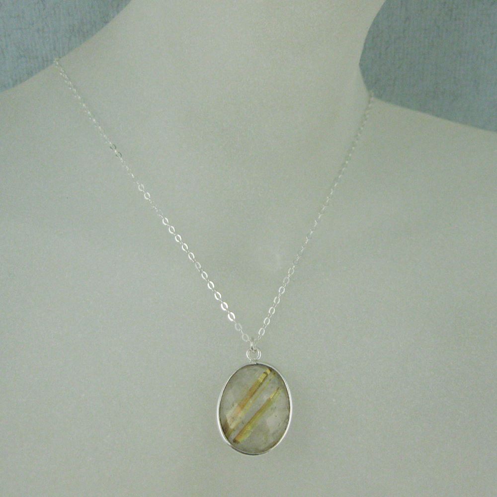 Bezel Gemstone Oval Pendant Necklace - Silver Sterling Chain - Gold Rutilated Quartz (16-24")