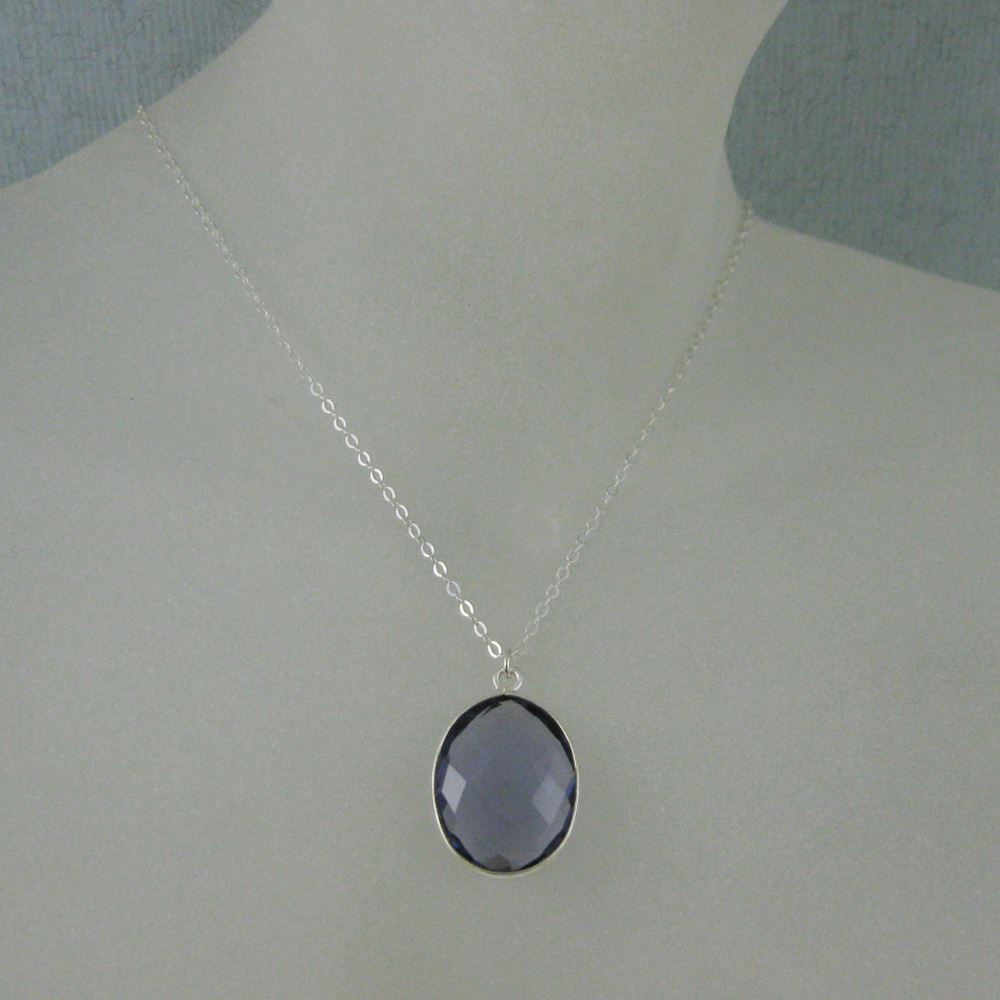 Bezel Gemstone Oval Pendant Necklace - Silver Sterling Chain - Iolite Quartz (16-24")