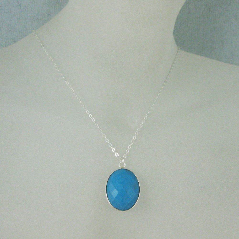 Bezel Gemstone Oval Pendant Necklace - Silver Sterling Chain - Turquoise (16-24")