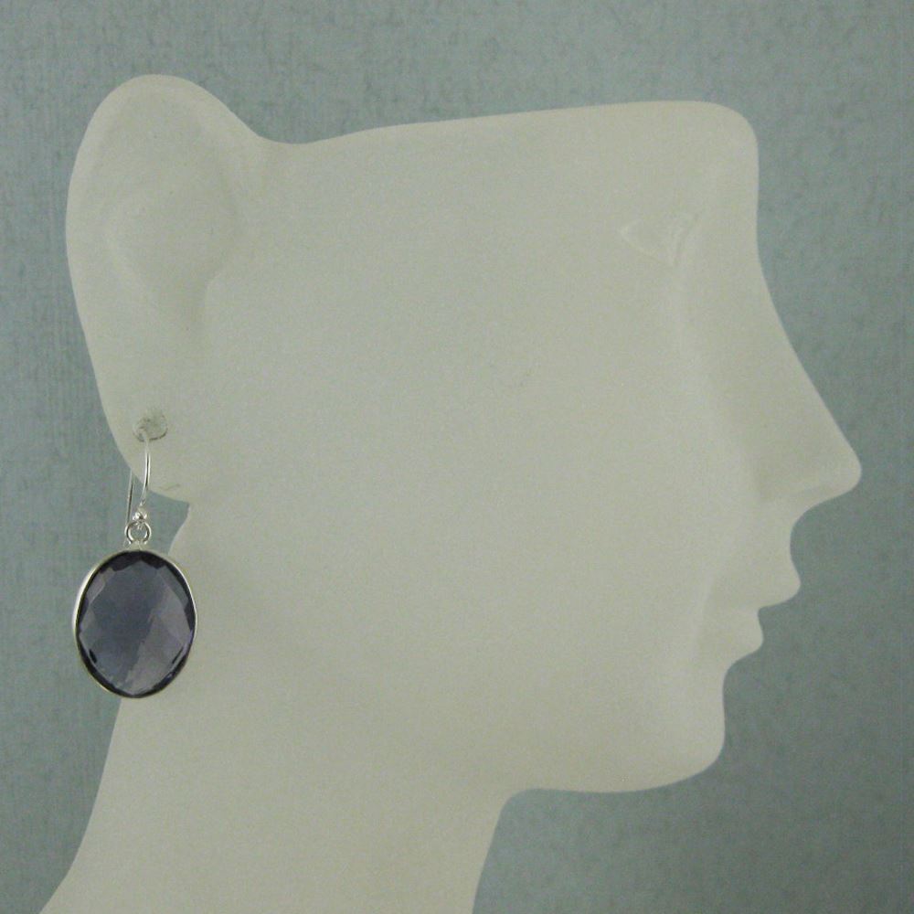 Bezel Gemstone Oval Shaped Pendant Earrings - Sterling Silver Hooks - Iolite Quartz