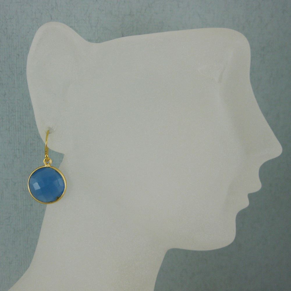 Bezel Gemstone Round Pendant Earrings - Gold Plated Hooks - Blue Chalcedony