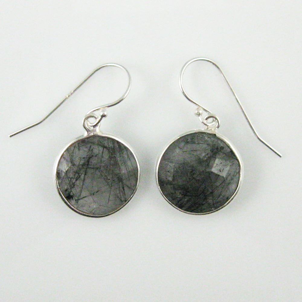Stone: Black Rutilated QuartzStone Shape: Faceted coin shape on both sides. Pendant Measurement: 19mm long, stone is 14mm. Total Earring Length: 25mm