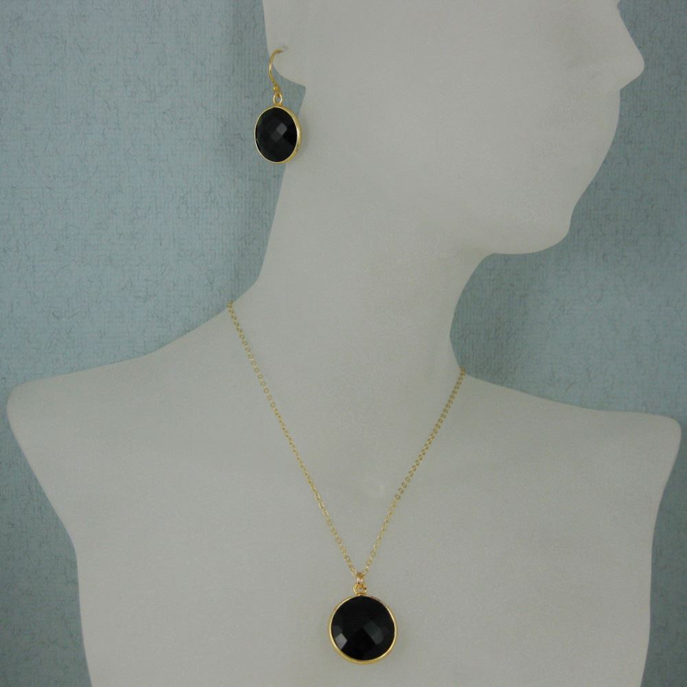 Bezel Gemstone Round Pendant Necklace & Earrings-Gold Plated-Black Onyx (16-24")
