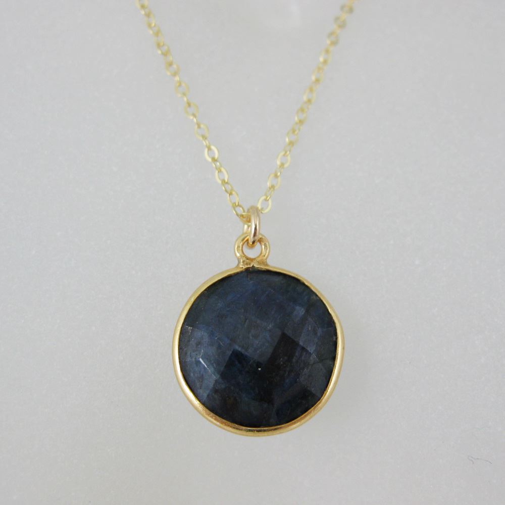 Stone: Blue Sapphire Dyed- Dyed RopadaStone Shape: Faceted coin shape on both sides. Pendant Measurement: 19mm long, stone is 14mm.